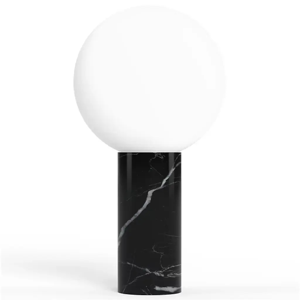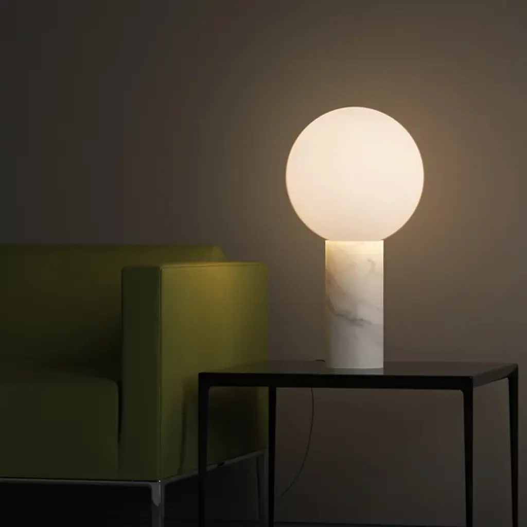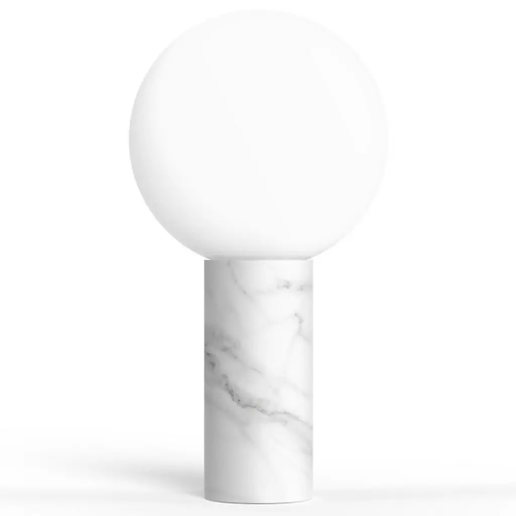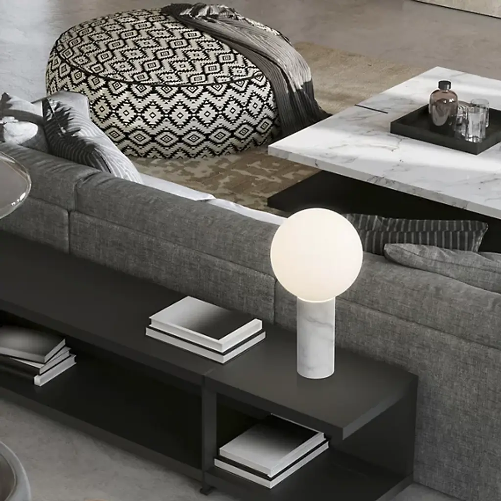Lend smooth, modern refinement with the clean lines and simple geometric shapes of the Pilar LED Table Lamp from Pablo Designs. A sleek structure with an appealing modern style, it starts with a cylindrical base and body of natural marble, elevating a bright and power-efficient LED lamp beneath a translucent globe shade of opal glass. The shade creates a warm glow that washes outward, burnishing the uniquely veined surface of each marble base, creating a unique character with each lamp that is still able to coordinate with neighboring fixtures.