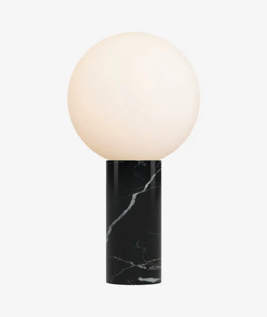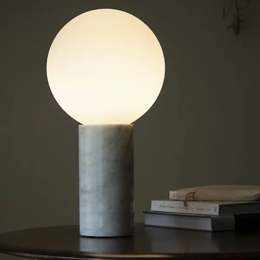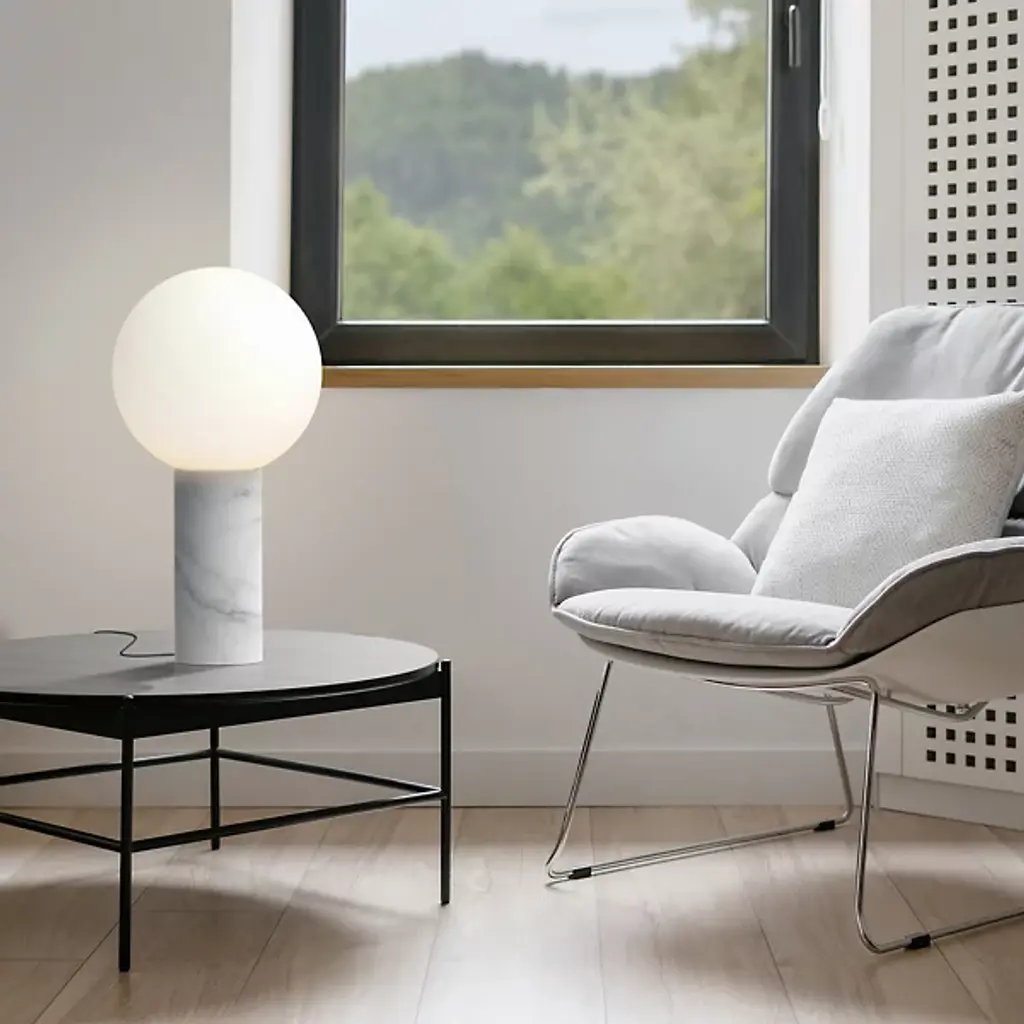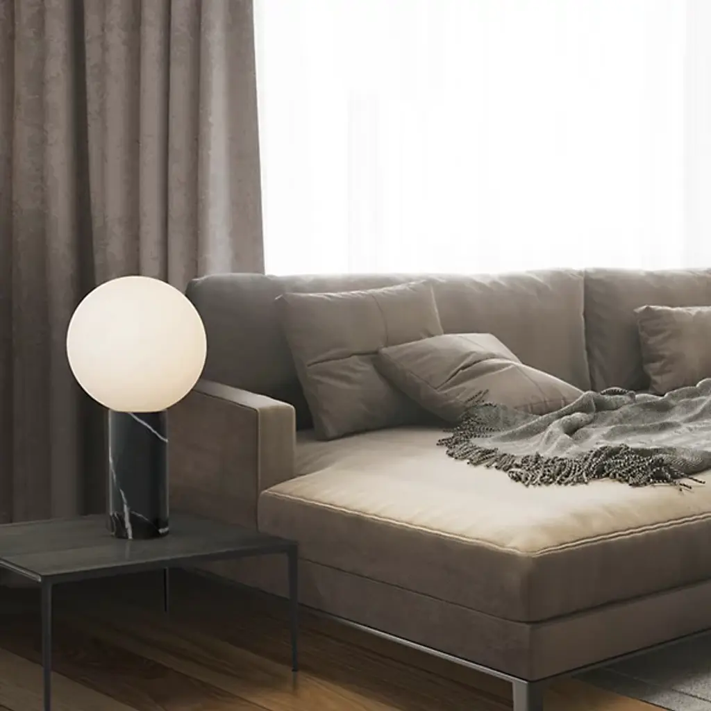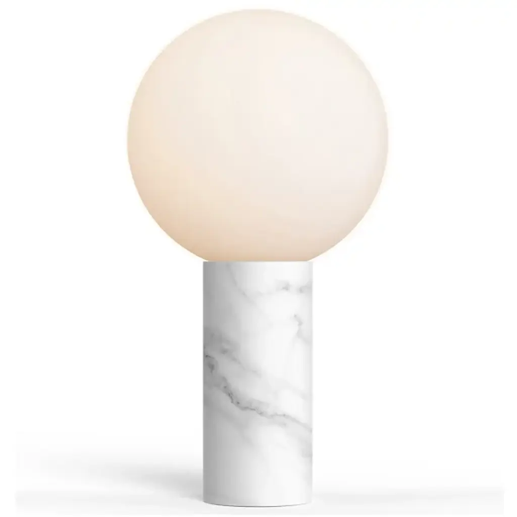 Lend smooth, modern refinement with the clean lines and simple geometric shapes of the Pilar LED Table Lamp from Pablo Designs. A sleek structure with an appealing modern style, it starts with a cylindrical base and body of natural marble, elevating a bright and power-efficient LED lamp beneath a translucent globe shade of opal glass. The shade creates a warm glow that washes outward, burnishing the uniquely veined surface of each marble base, creating a unique character with each lamp that is still able to coordinate with neighboring fixtures.