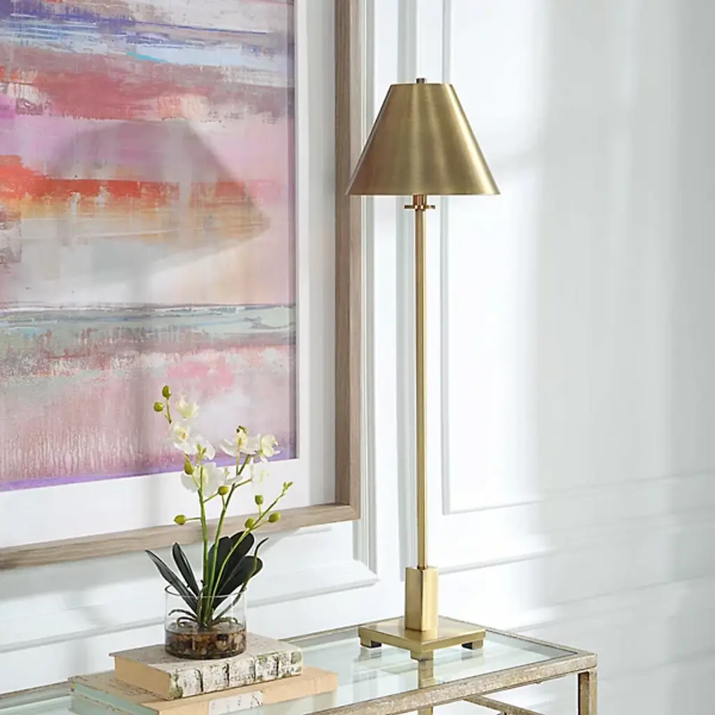 The Pilot Buffet Lamp from Uttermost showcases a slender metal construction finished in a sophisticated satin sheen. Its sleek design perfectly complements a coordinating metal empire shade, creating a seamless and stylish look. The lamp's base is elegantly enhanced with a marble foot featuring natural white veining, adding a touch of classic refinement. This lamp not only provides beautiful illumination but also serves as an elegant accent piece, elevating the aesthetic of any space.