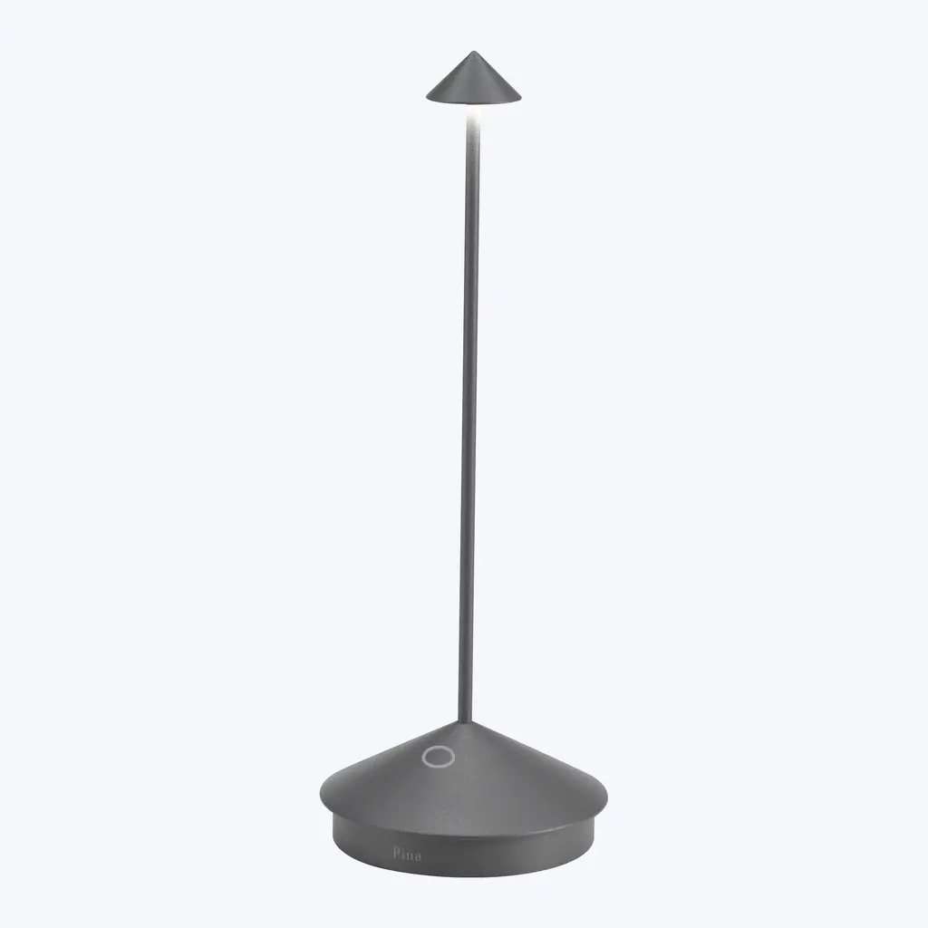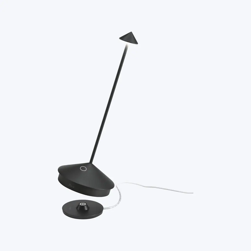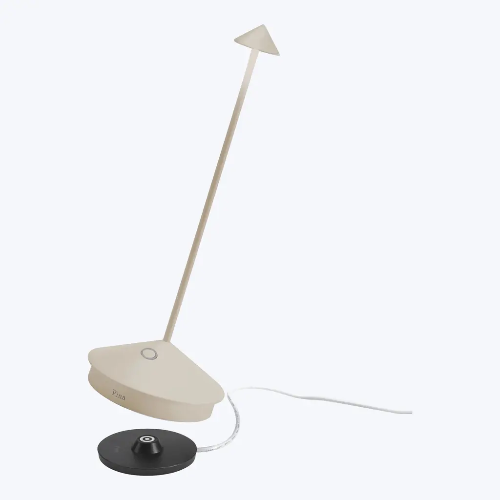 Petite in scale, powerful in presence. The Pina Table Lamp delivers soft, ambient light with a sleek, cordless design that moves effortlessly from indoors to out. At just over 11 inches tall, it’s the perfect companion for intimate tables, cozy corners, or alfresco evenings. Tap the touch control at the base to power on, dim the light, or shift between three color temperatures—2200K, 2700K, or 3000K—tailoring the mood to the moment. The built-in rechargeable battery offers up to 13 hours of illumination on a full charge, and a discreet indicator system ensures recharging is always optimized. Rated IP54, the Pina Pro is suitable for outdoor use (excluding metallic-leaf finishes) and comes complete with a contact charging base and USB adapter. Optional accessories like a ceramic tray or floor stand (sold separately) allow for further customization. Lightweight, minimalist, and thoughtfully designed—this is lighting that goes wherever life takes you.