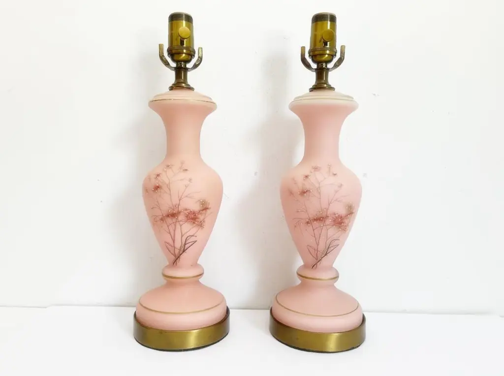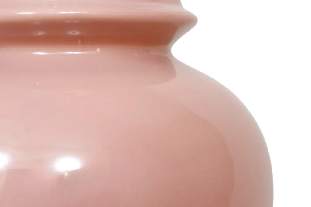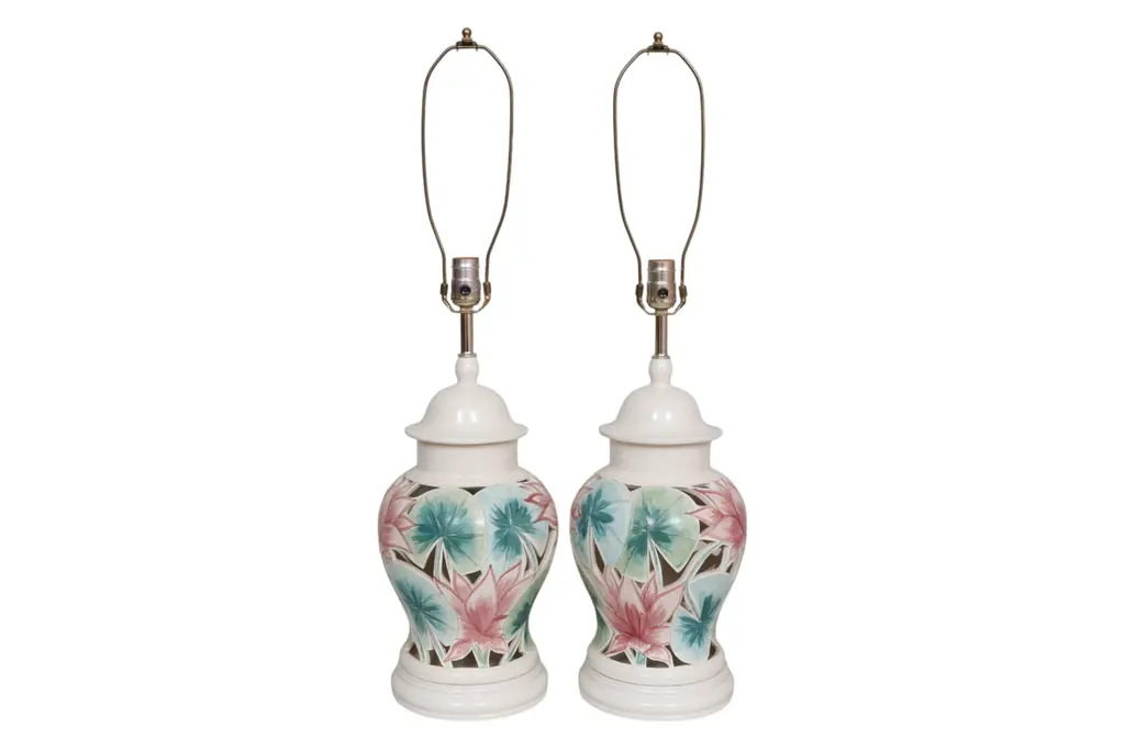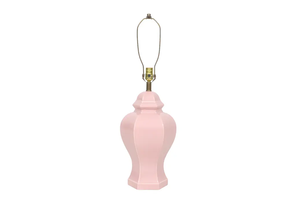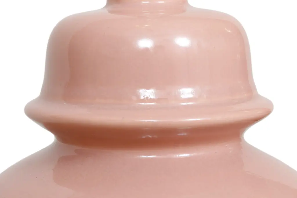 A pair of blush pink ceramic table lamps. Elegantly turned in a chinoiserie temple jar shape with a flared beveled base. Each lamp measures 9"W x 9"D x 20"H to top of socket, 28.5"H to top of finial.