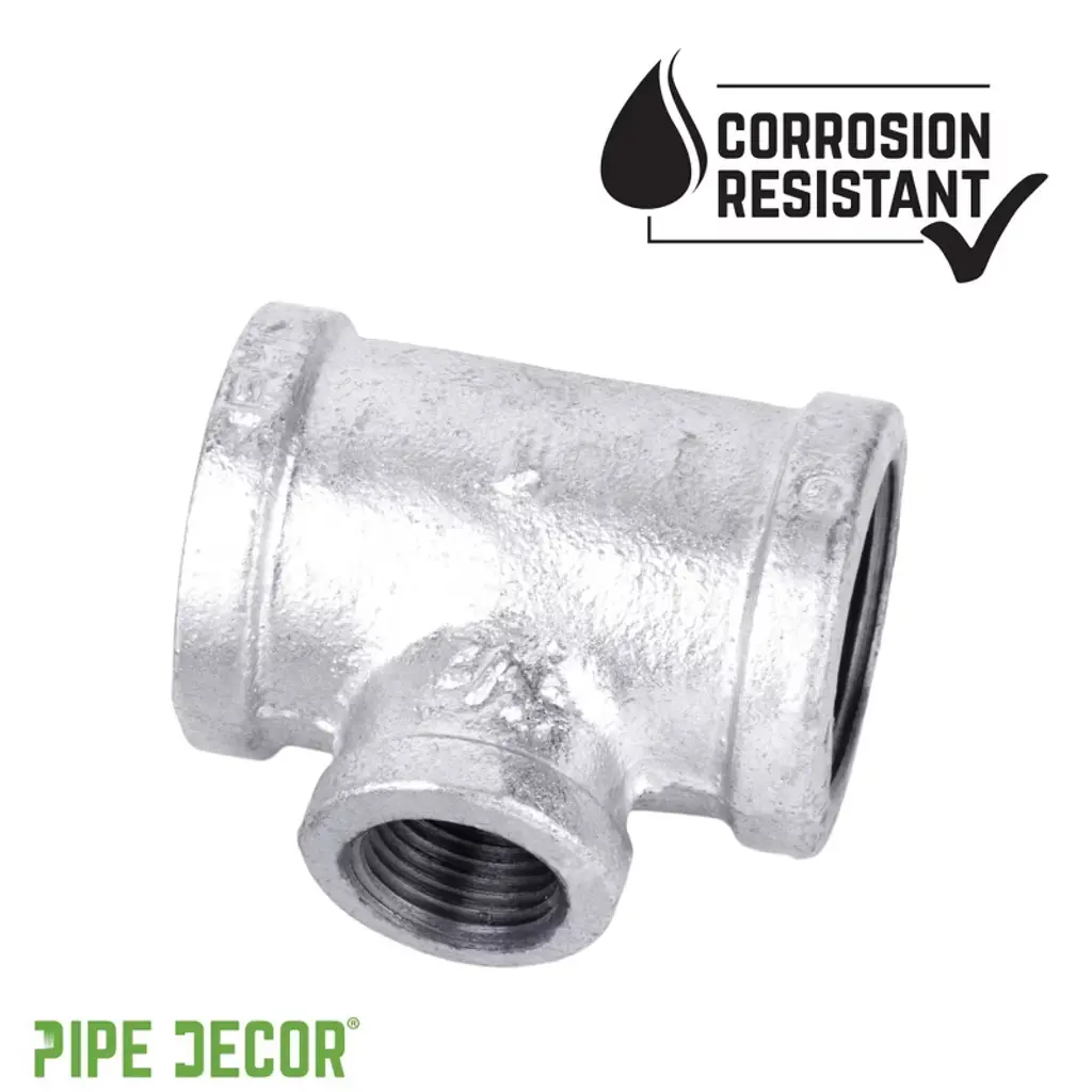 Reducing tees give you the flexibility to build the project of your dreams. You can use a galvanized reducing tee in almost any project where you would normally use a regular tee, as long as the smaller pipe size can support the weight of your design. Combining two different pipe sizes can create a unique visual effect that sets your project apart. Galvanized fittings feature a silver finish that adds a clean, polished look to your pipe furniture. Made from durable, industrial-grade malleable iron, these fittings are 100% authentic and built to stand the test of time. You will recognize PIPE DECOR parts and accessories by their quality—beauty and beast, strength and style. These are real industrial fittings for your decorations and designs, so accept no substitutes. Extra pieces and accessories are available for custom projects and expansions, allowing you to plug and play as desired. Galvanized pipe fittings are corrosion-resistant, making them perfect for creating DIY furniture without worrying about rust. They are project-ready and require no cleaning or sealing before use. The iron fittings complement a variety of aesthetics, including steampunk lighting, industrial, factory, French country farmhouse, vintage, retro, reclamation, DIY customized, modern, and more. IPS threads ensure compatibility with other project materials such as lamp parts, valves, and additional pipes, fittings, and PIPE DECOR furniture kits of the same diameter.