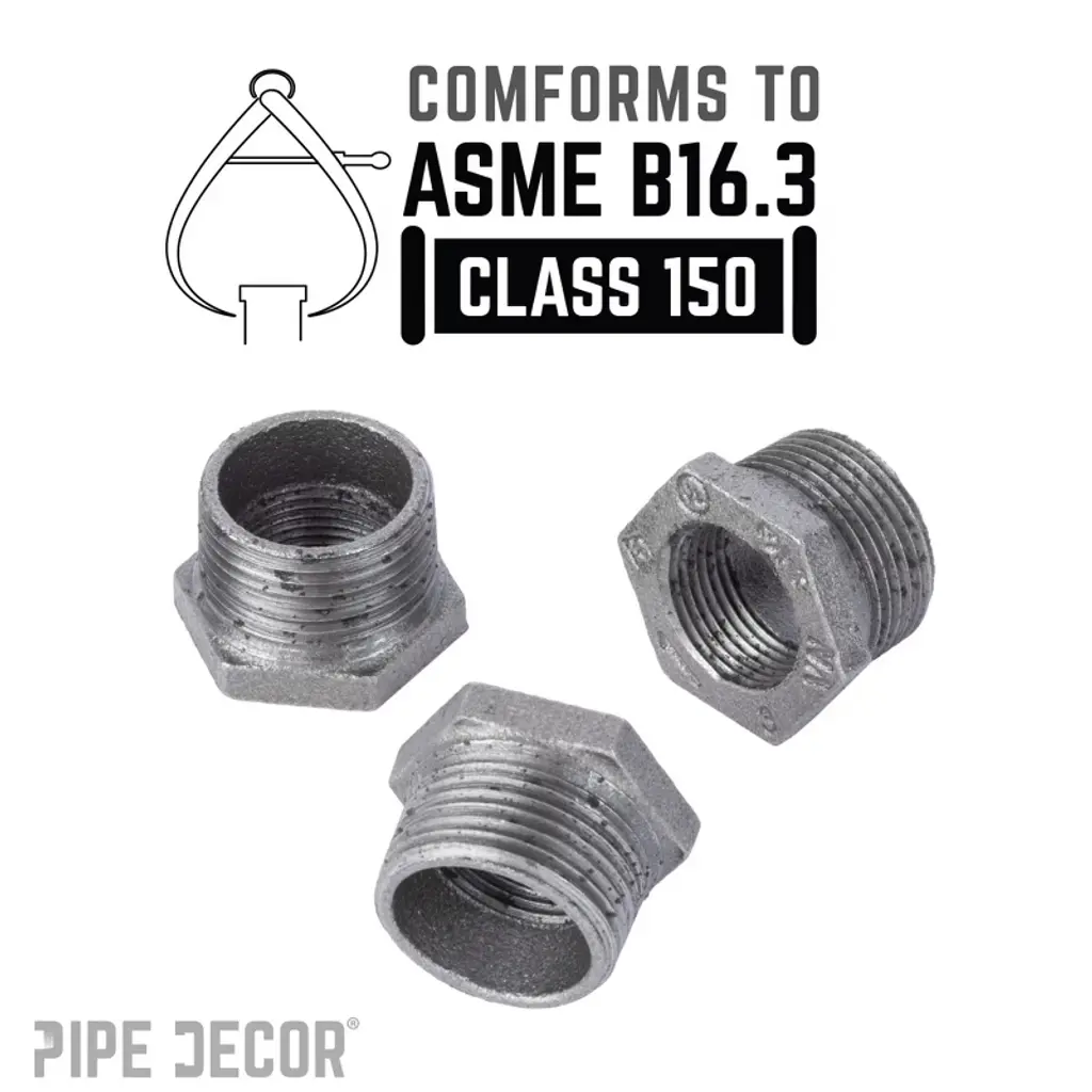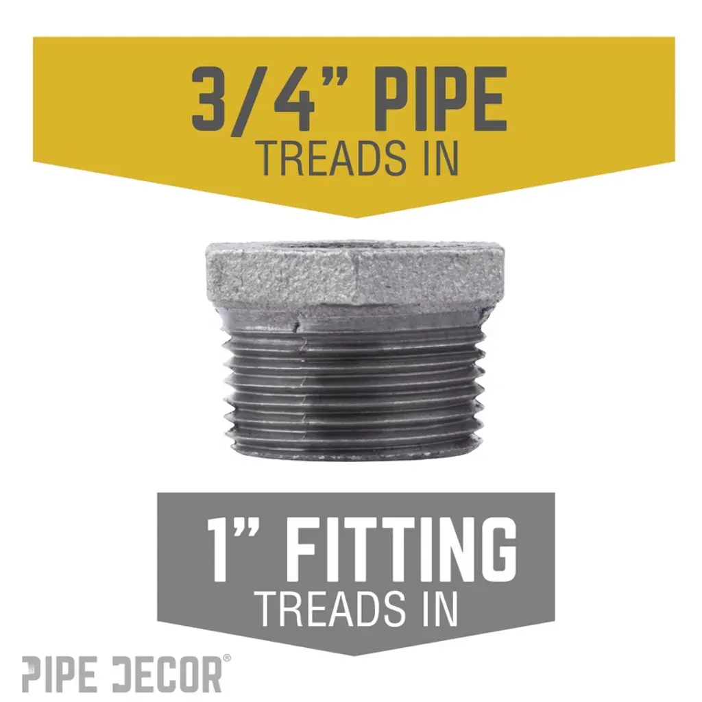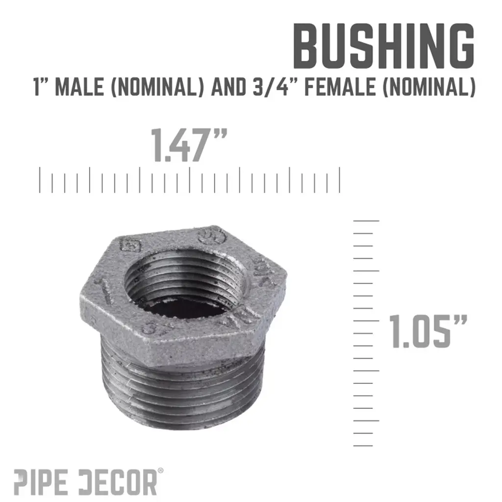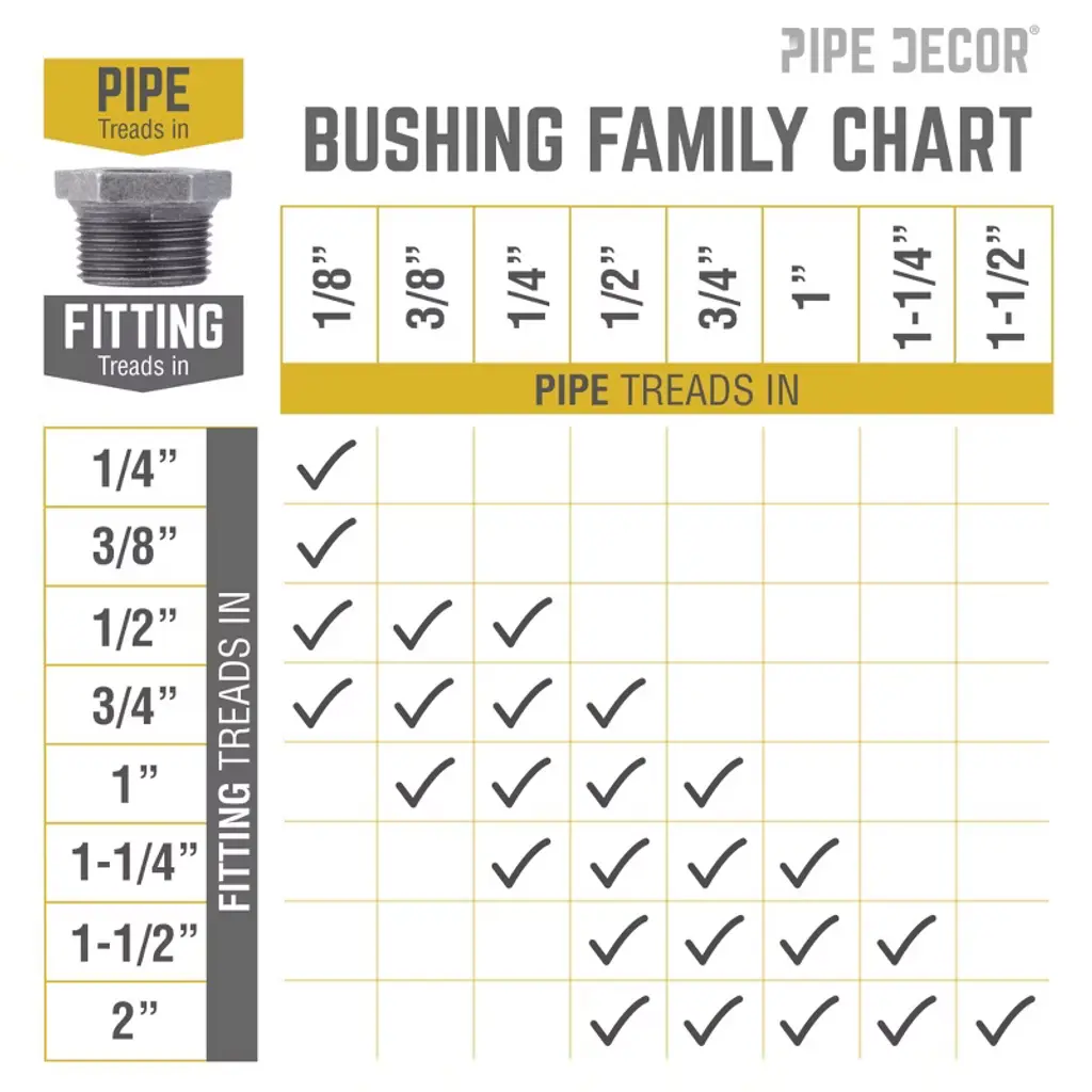 Make your standard fittings more versatile with our black bushings, which can be used in any project that involves connecting a larger fitting with a smaller pipe. They help you get the most out of your DIY creations. Our fittings are made from durable, industrial-grade malleable iron, 100% authentic, and built to stand the test of time. You will know PIPE DECOR parts and accessories when you hold them—beauty and beast, strength and style. These are real industrial fittings for your decorations and designs, so accept no substitutes. Extra pieces and accessories are available for your custom projects and expansions, allowing for plug-and-play as desired. Ideal for any DIY project, our iron fittings complement a wide variety of aesthetics, including steampunk lighting, industrial, factory, French country farmhouse, vintage, retro, reclamation, DIY customized, modern, and more. We recommend cleaning and sealing each fitting before use. IPS threads ensure compatibility with other project materials such as lamp parts and valves, and these fittings work seamlessly with any pipes, fittings, and PIPE DECOR furniture kits of the same diameter.