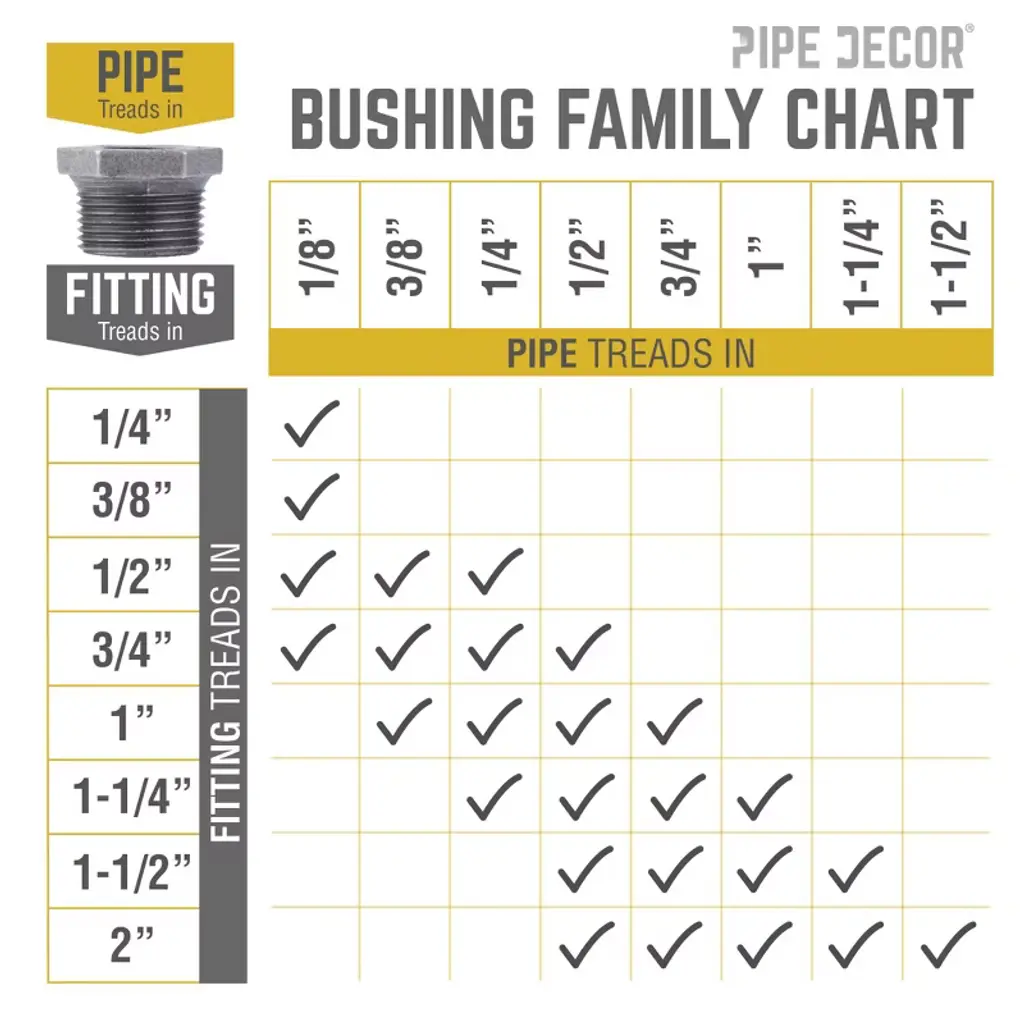Make your standard fittings more versatile with our black bushings, which can be used in any project that involves connecting a larger fitting with a smaller pipe. They allow you to get the most out of your DIY creations. Our fittings are made with durable, industrial-grade malleable iron, 100% authentic, and designed to stand the test of time. You will know PIPE DECOR parts and accessories when you hold them—beauty and beast, strength and style. These are real industrial fittings for your decorations and designs, so accept no substitutes. Extra pieces and accessories are available for custom projects and expansions, allowing for plug-and-play as desired. Perfect for any DIY project, our iron fittings complement a variety of aesthetics, including steampunk lighting, industrial, factory, French country farmhouse, vintage, retro, reclamation, DIY customized, modern, and more. We recommend cleaning and sealing each fitting before use. IPS threads offer compatibility with other project materials such as lamp parts, valves, and more, and they are fully compatible with any pipes, fittings, and PIPE DECOR furniture kits of the same diameter.