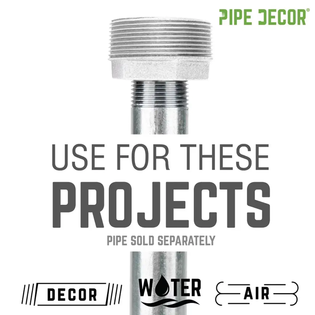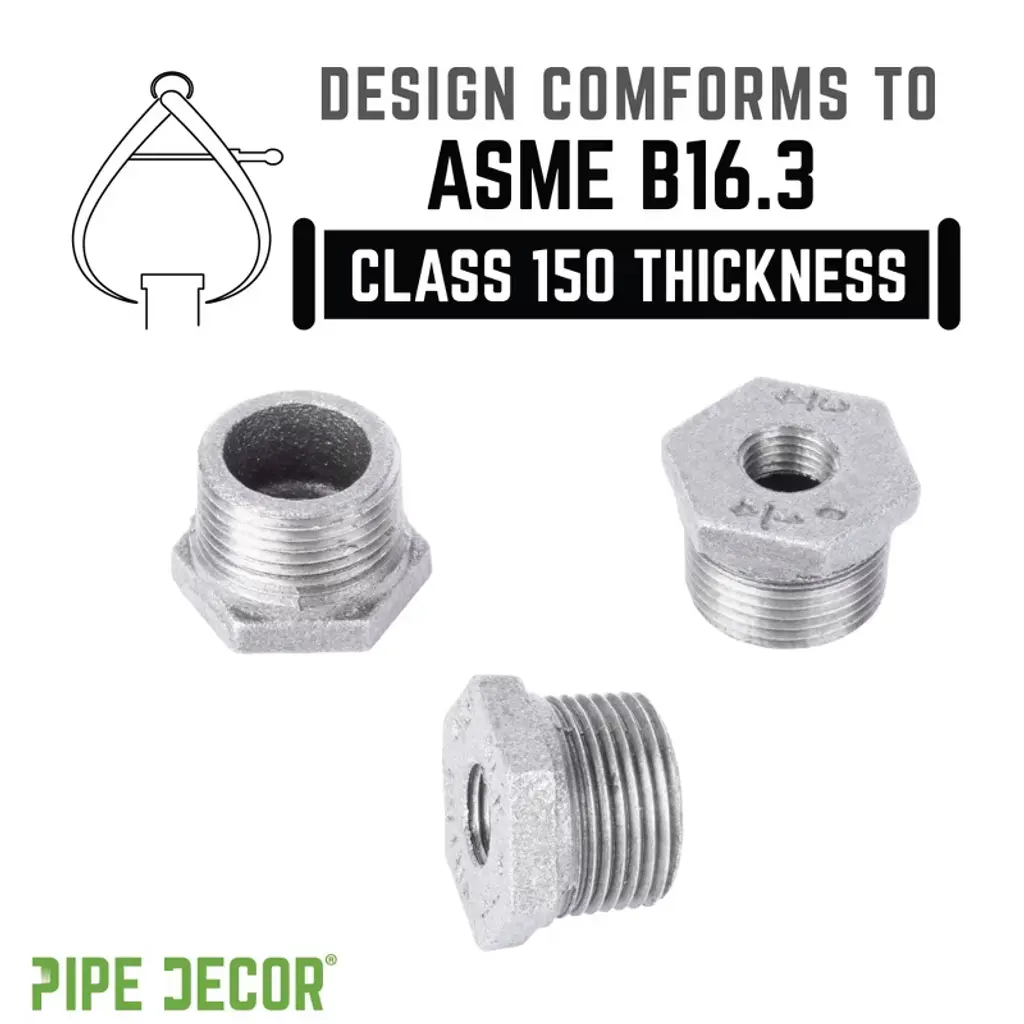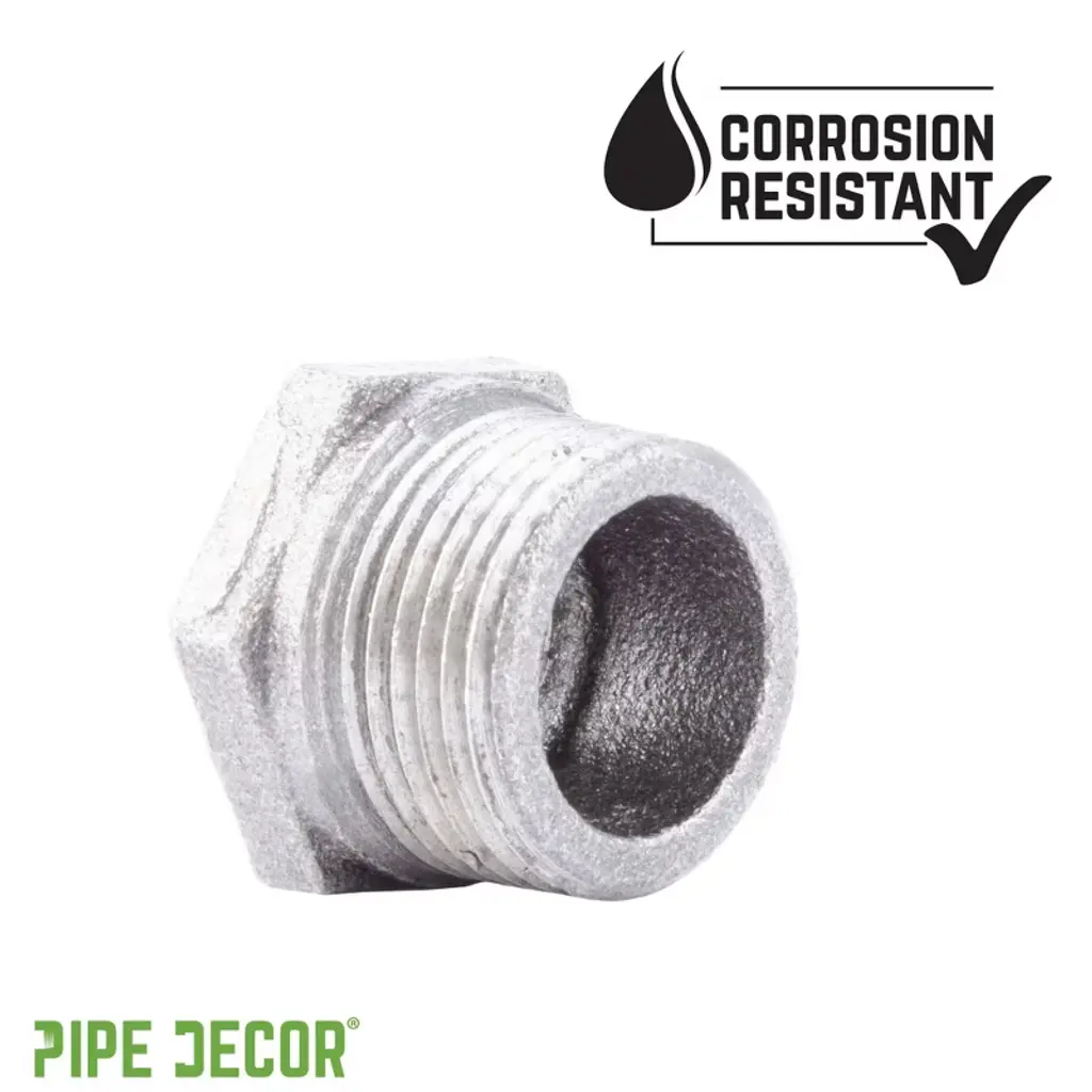 Make your standard fittings more versatile with our galvanized bushings. A bushing can be used in any project that involves connecting a larger fitting with a smaller pipe, helping you get the most out of your DIY creations. Galvanized fittings feature a silver color with a shiny finish, giving your pipe furniture a clean, polished look. Made from durable, industrial-grade malleable iron, these fittings are 100% authentic and built to stand the test of time. You will recognize PIPE DECOR parts and accessories by their unmistakable combination of beauty and strength—real industrial fittings for your designs. Accept no substitutes. Extra pieces and accessories are available for custom projects and expansions, allowing you to plug and play as desired. These galvanized pipe fittings are corrosion-resistant, making them ideal for creating DIY furniture without worrying about rust. They are project-ready and require no cleaning or sealing before use. Iron fittings complement a wide variety of styles and aesthetics, including steampunk lighting, industrial, factory, French country farmhouse, vintage, retro, reclaimed, DIY customized, modern, and more. IPS threads provide compatibility with other project materials such as lamp parts, valves, and additional PIPE DECOR furniture kits of the same diameter.
