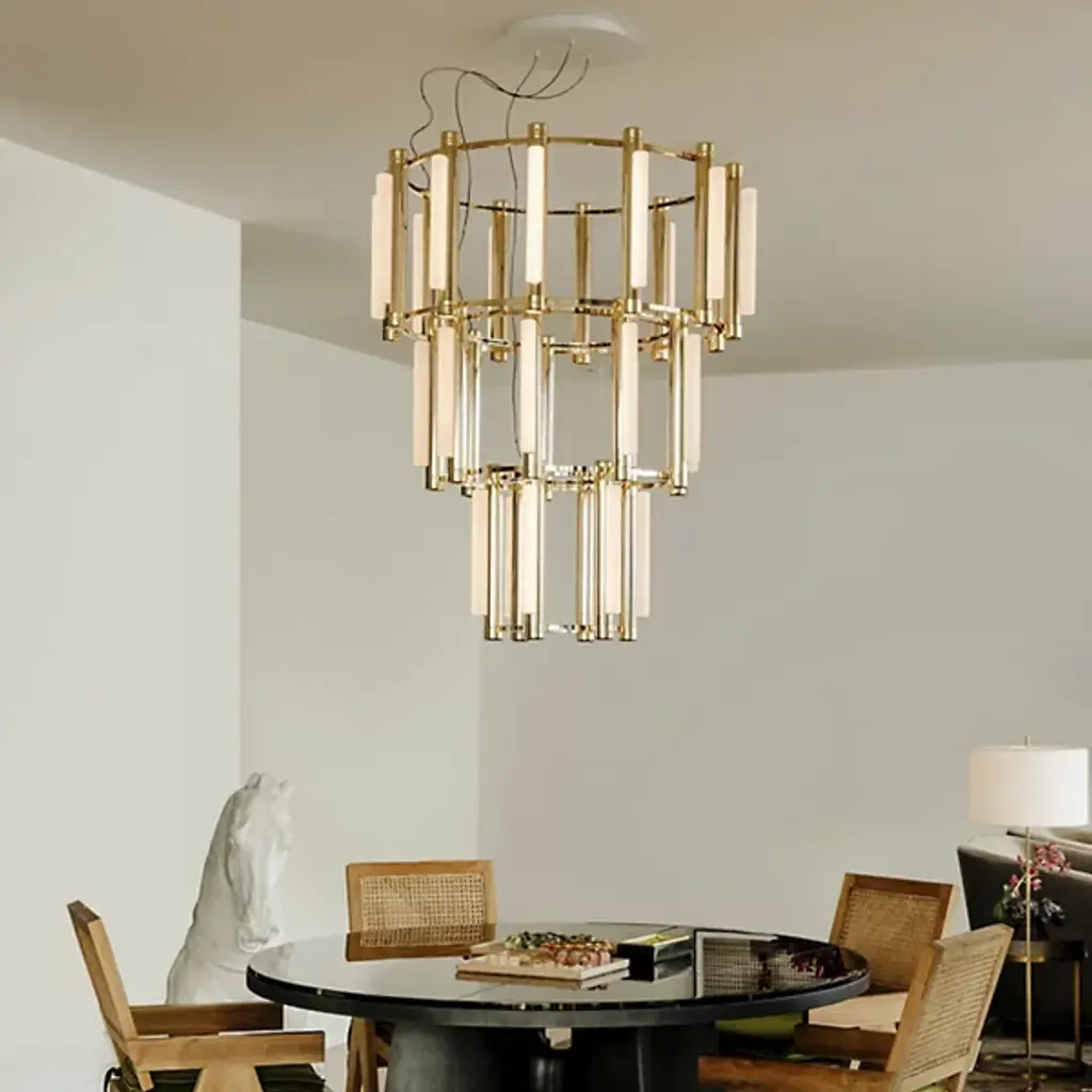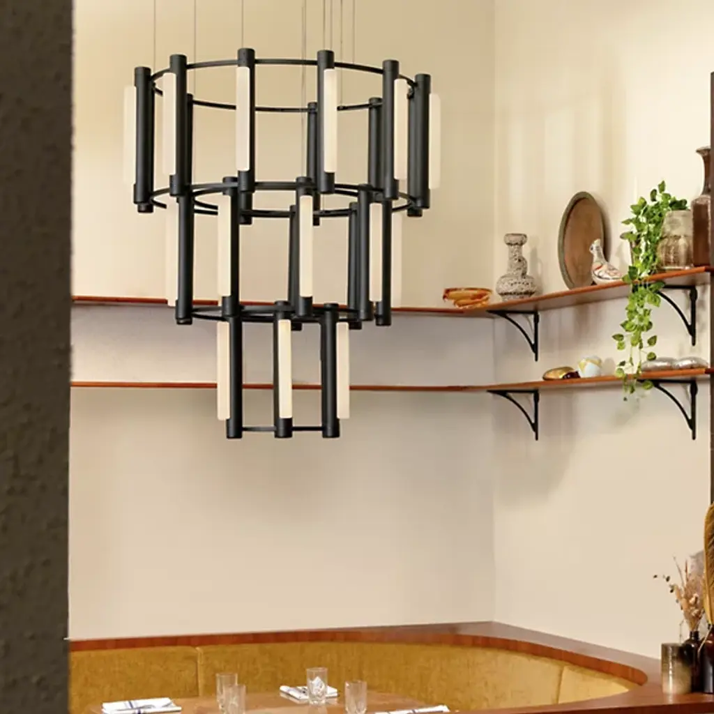 The Pipeline LED 3 Tier Chandelier by ANDlight enhances indoor living spaces with an airy and elegant form that appears to float when suspended in midair. A Canadian-made design from the mind of Caine Heintzman, it’s retained by a set of thin, durable aircraft cables, while a slender array of concentric hoops holds a set of smooth aluminum tubes around their edges, creating an open, inverted “layer cake” design with three tiers of lamping that contract as they drop. A small but strong LED rests inside each aluminum tube, gentled by a series of acrylic diffusers that obscure direct glare.