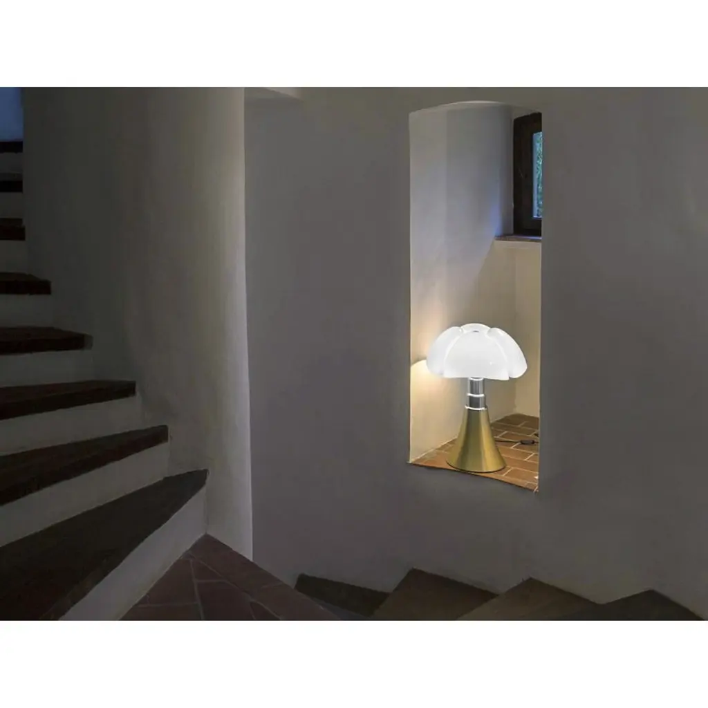Pipistrello Medium by Martinelli Luce is a whimsical table lamp created by the Italian designer Gae Aulenti in 1965. The name of the luminaire, Pipistrello, comes from the Italian word for bat, alluding to the playful and distinctive shape of the opal white shade that resembles the wings of a bat. The height of the lamp can be adjusted with the telescopic steel base.