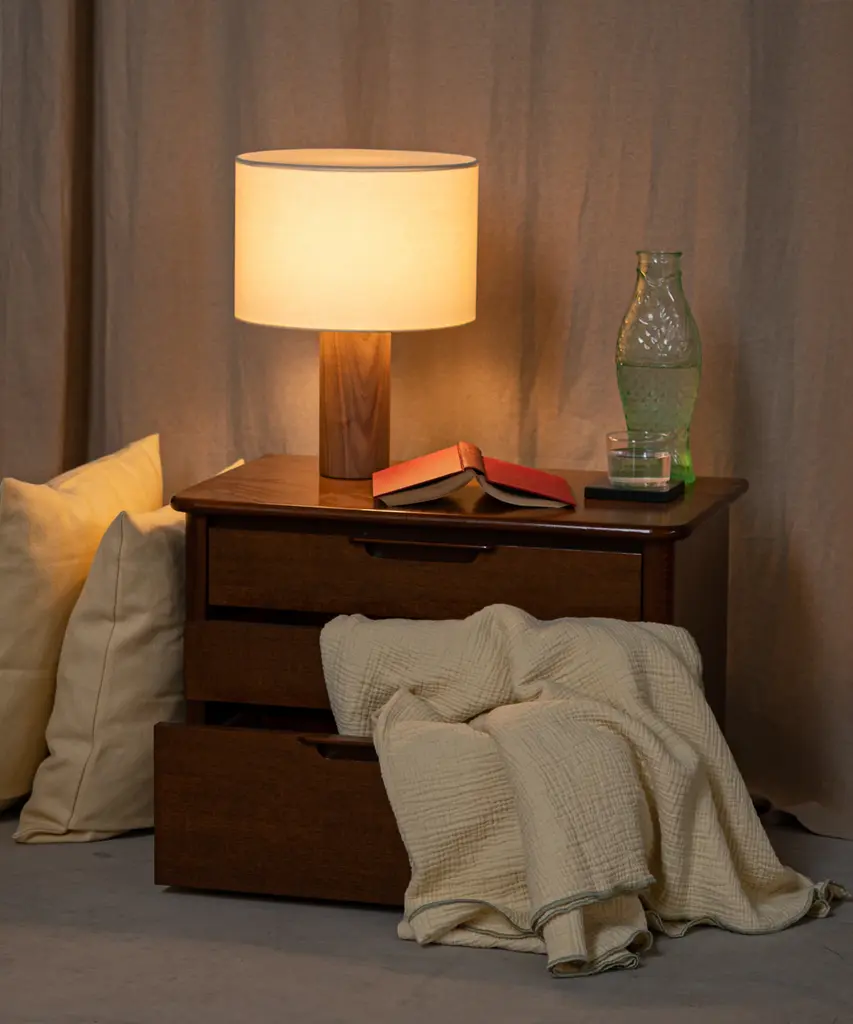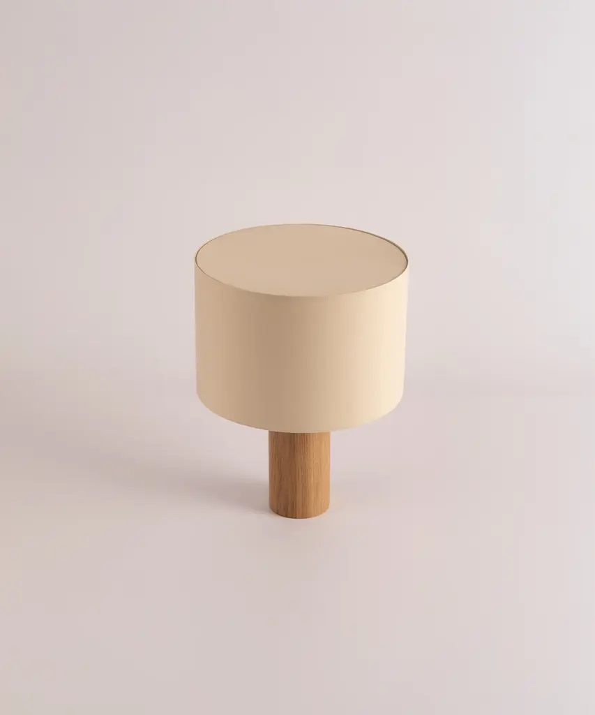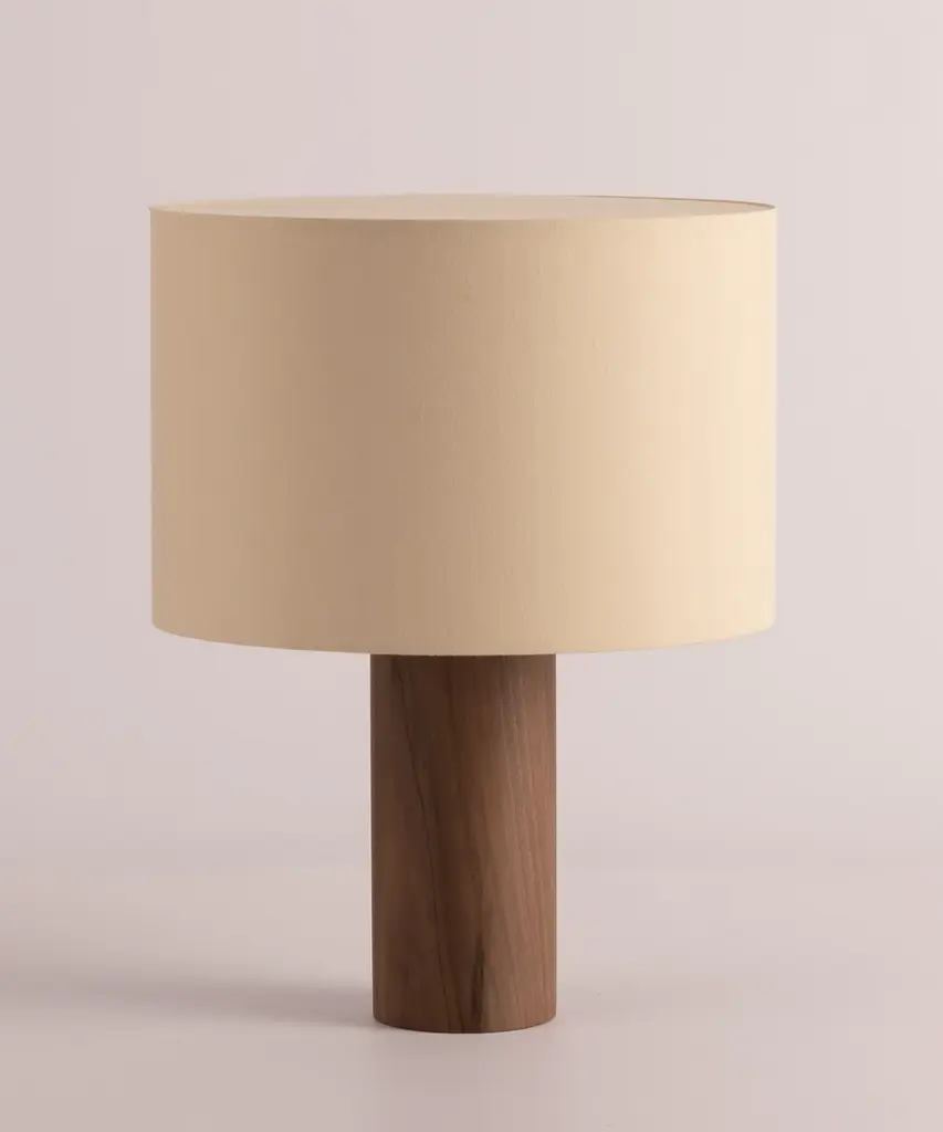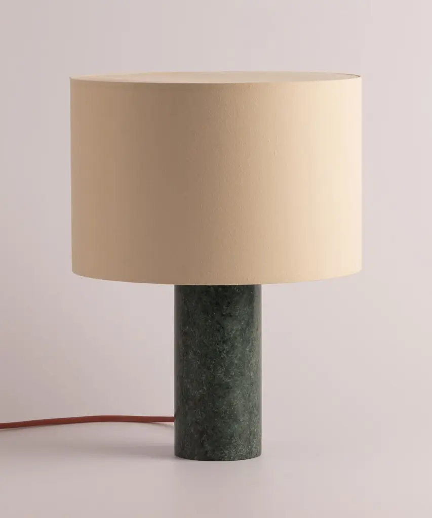 A classic table lamp shape magnifies minimalism and purity, in which materials and quality become the fundamentals. A selection of natural marble and hardwood colors match Simone & Marcel's unique cotton drum lampshade. Each Simone & Marcel lighting fixture is hand-made to order in the designers' studio located in rural Spain. Every product uses only materials and components sourced from local suppliers, all within a short drive of their workshop - an abandoned agricultural warehouse that the couple renovated themselves.