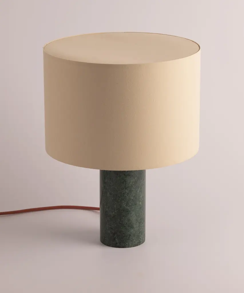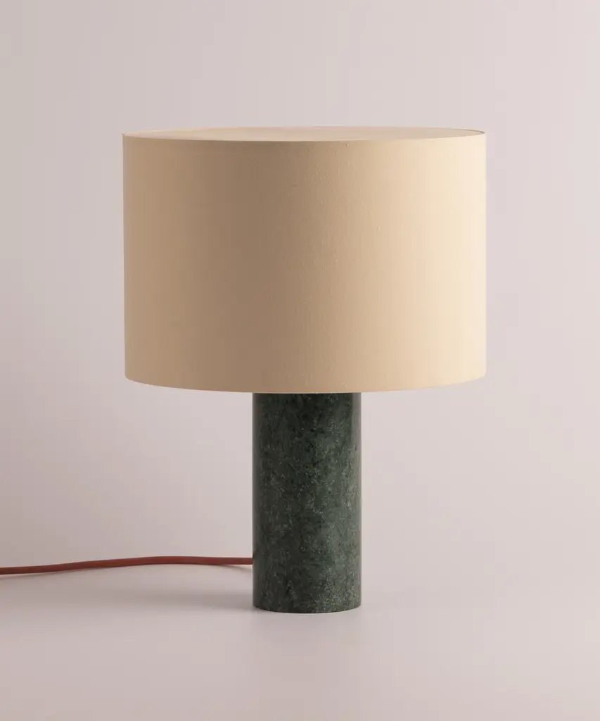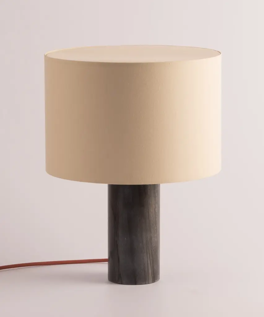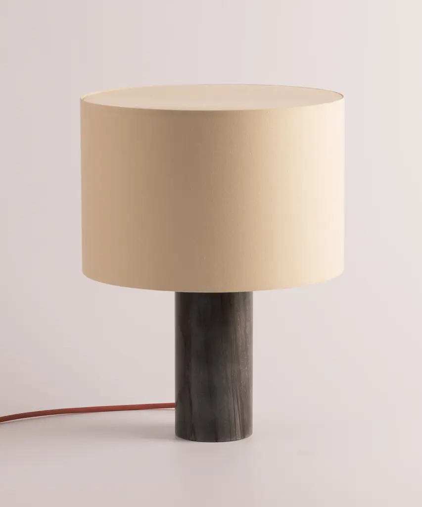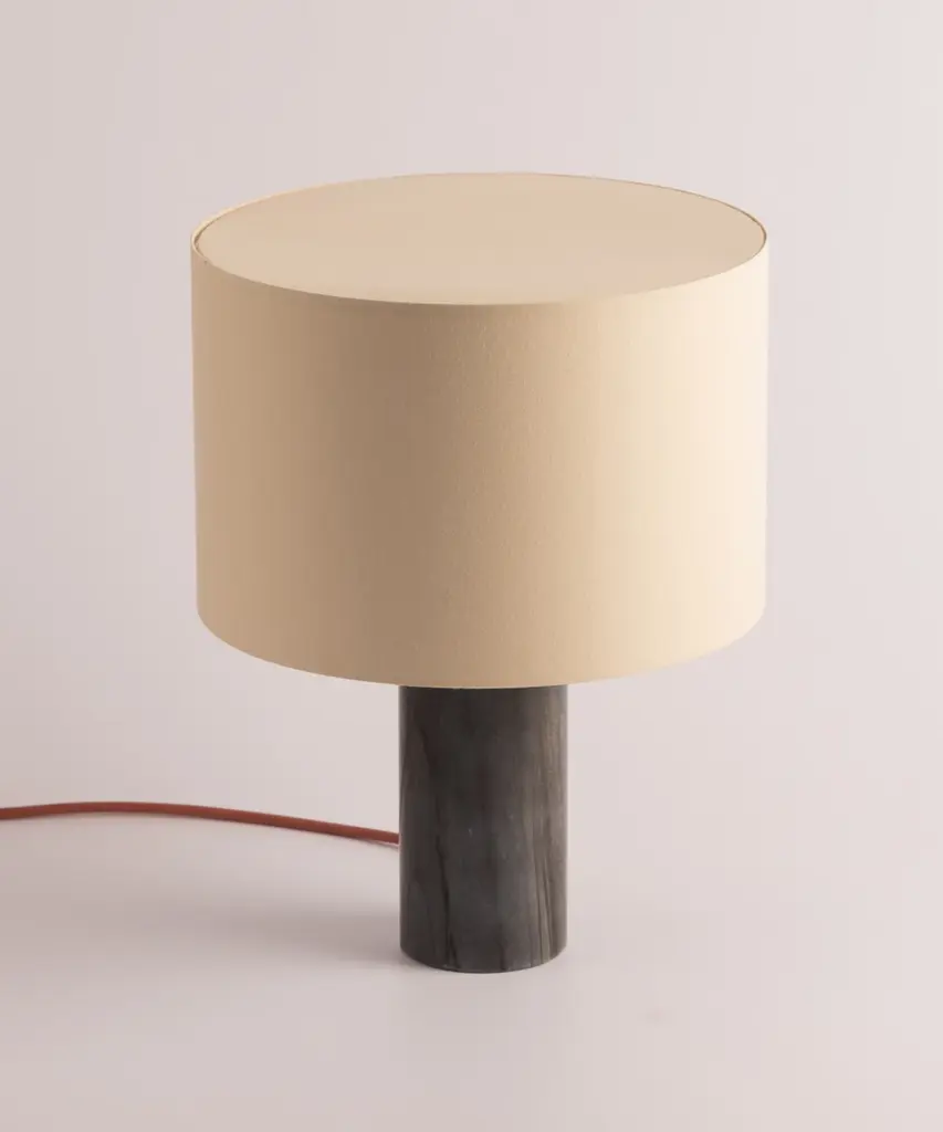 A classic table lamp shape magnifies minimalism and purity, in which materials and quality become the fundamentals. A selection of natural marble and hardwood colors match Simone & Marcel's unique cotton drum lampshade. Each Simone & Marcel lighting fixture is hand-made to order in the designers' studio located in rural Spain. Every product uses only materials and components sourced from local suppliers, all within a short drive of their workshop - an abandoned agricultural warehouse that the couple renovated themselves.