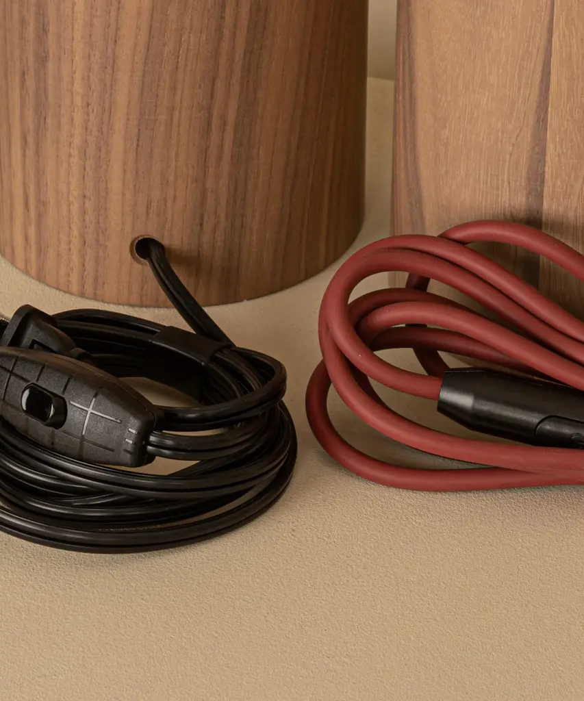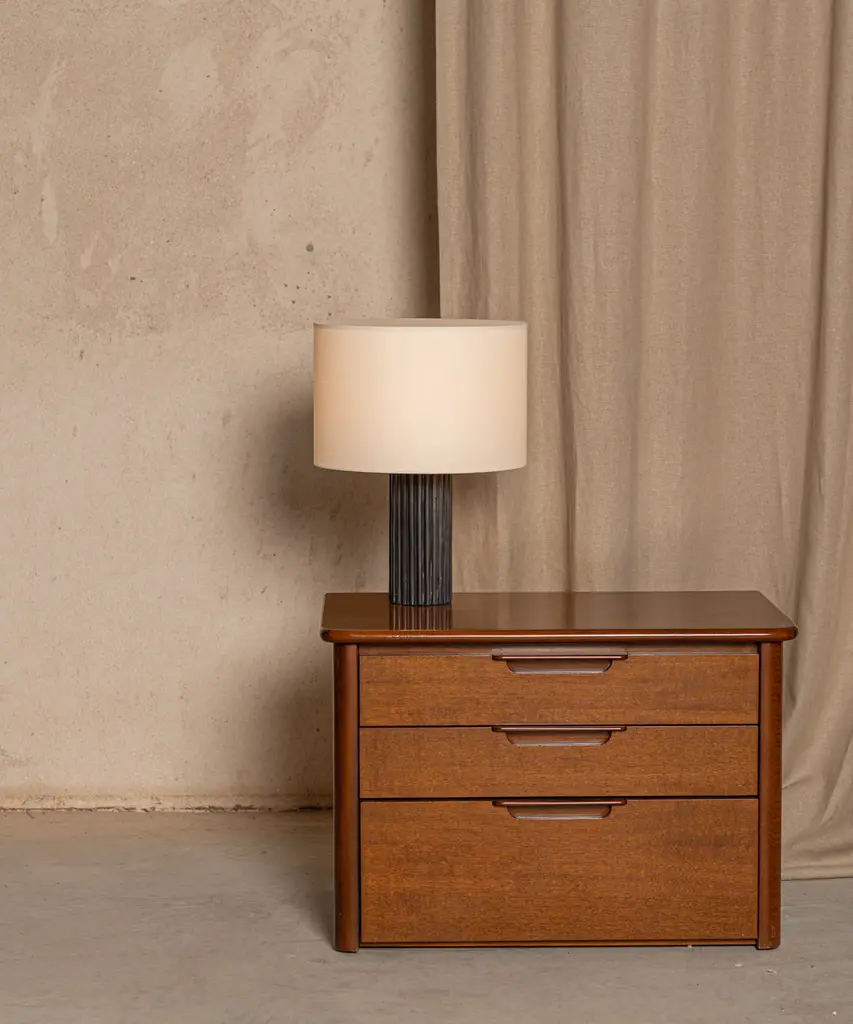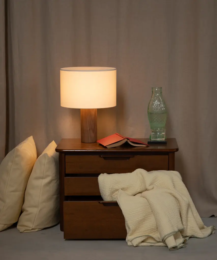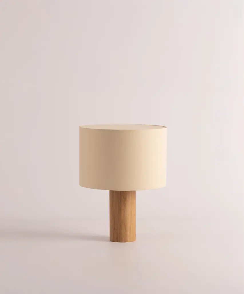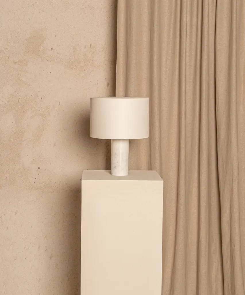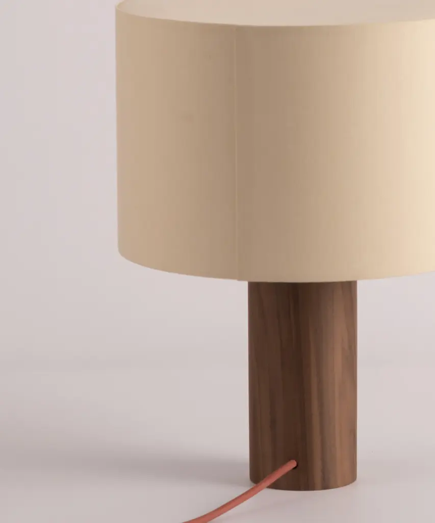A classic table lamp shape magnifies minimalism and purity, in which materials and quality become the fundamentals. A selection of natural marble and hardwood colors match Simone & Marcel's unique cotton drum lampshade. Each Simone & Marcel lighting fixture is hand-made to order in the designers' studio located in rural Spain. Every product uses only materials and components sourced from local suppliers, all within a short drive of their workshop - an abandoned agricultural warehouse that the couple renovated themselves.