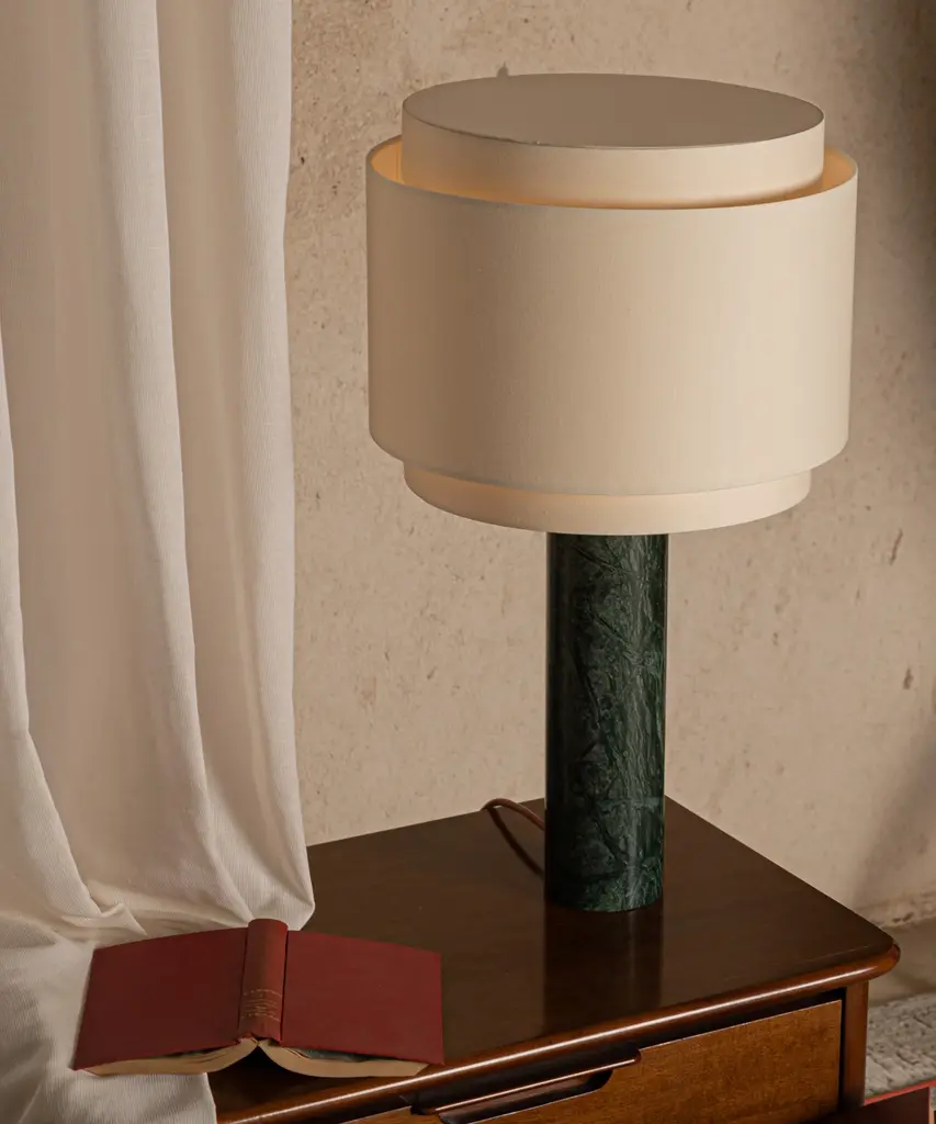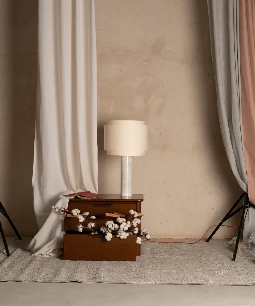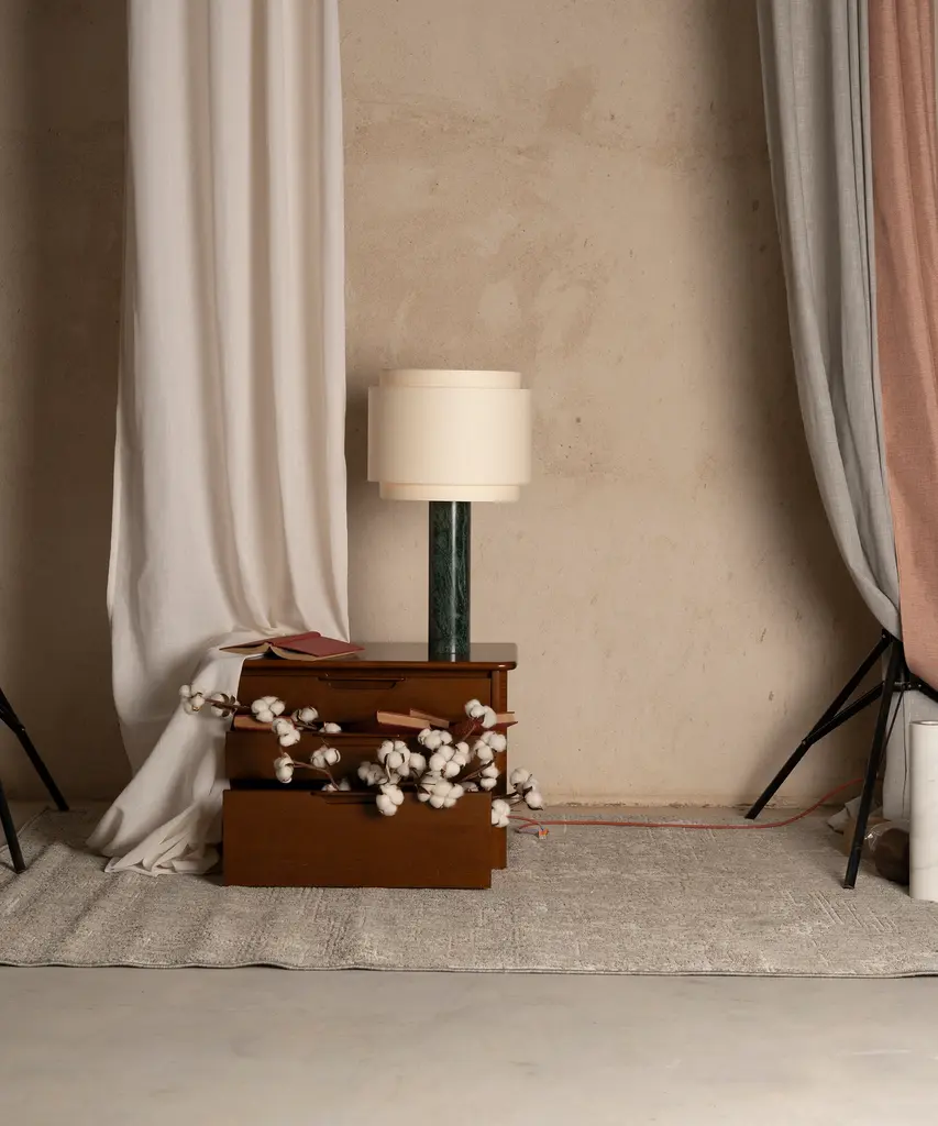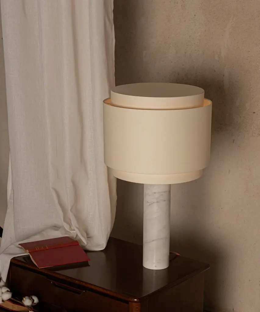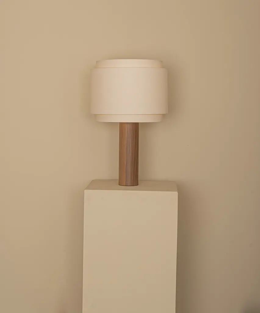 A unique lampshade in which geometries, materials, and superpositions merge to diffuse a soft light, sitting on the edge of a marble or wooden cylinder. Each Simone & Marcel lighting fixture is hand-made to order in the designers' studio located in rural Spain. Every product uses only materials and components sourced from local suppliers, all within a short drive of their workshop - an abandoned agricultural warehouse that the couple renovated themselves.