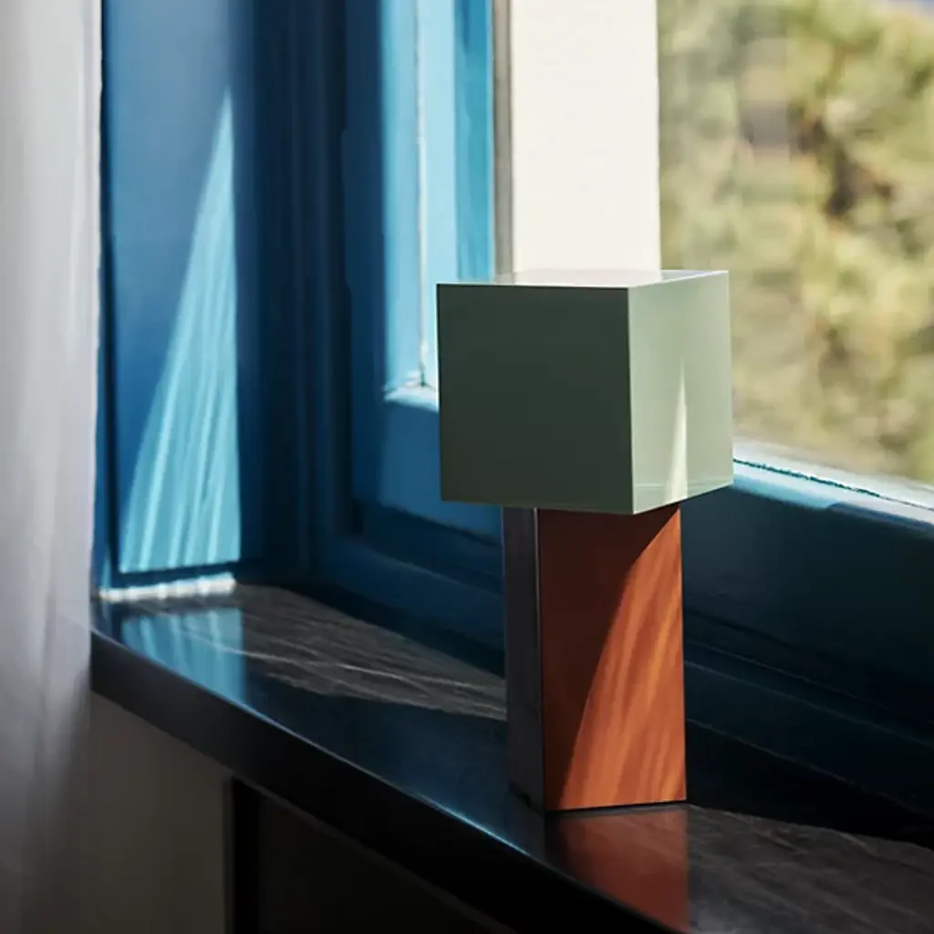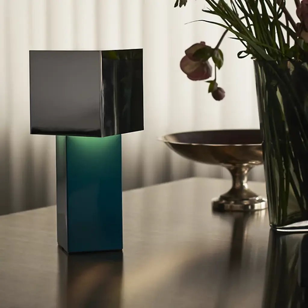 Take lighting on the go with the Pivot Rechargeable LED Table Lamp from &Tradition. A cubic, clever design fashioned from a mix of powder-coated iron and mirror-polished steel, its mix of rich colors and bold reflections creates an engaging feast for the senses. A marvelous design able to evoke natural and manmade light, it features a cubic shade at a 45-degree angle offset to the tall rectangular prism base. The lighting effect transforms rapidly at the tap of a touch dimmer, creating modern candlelight from its abstract form. •Can be used outdoors but must be taken inside for storage