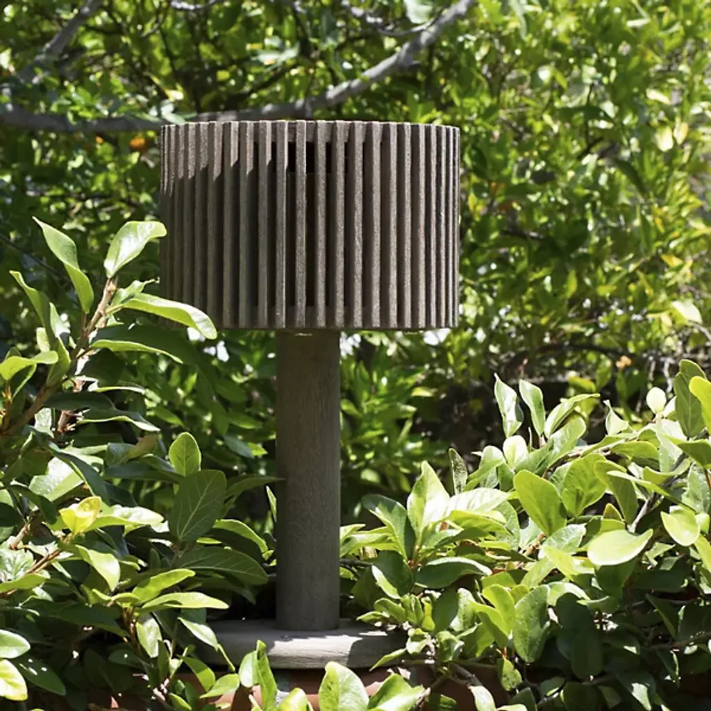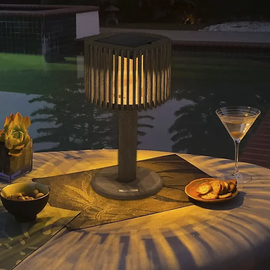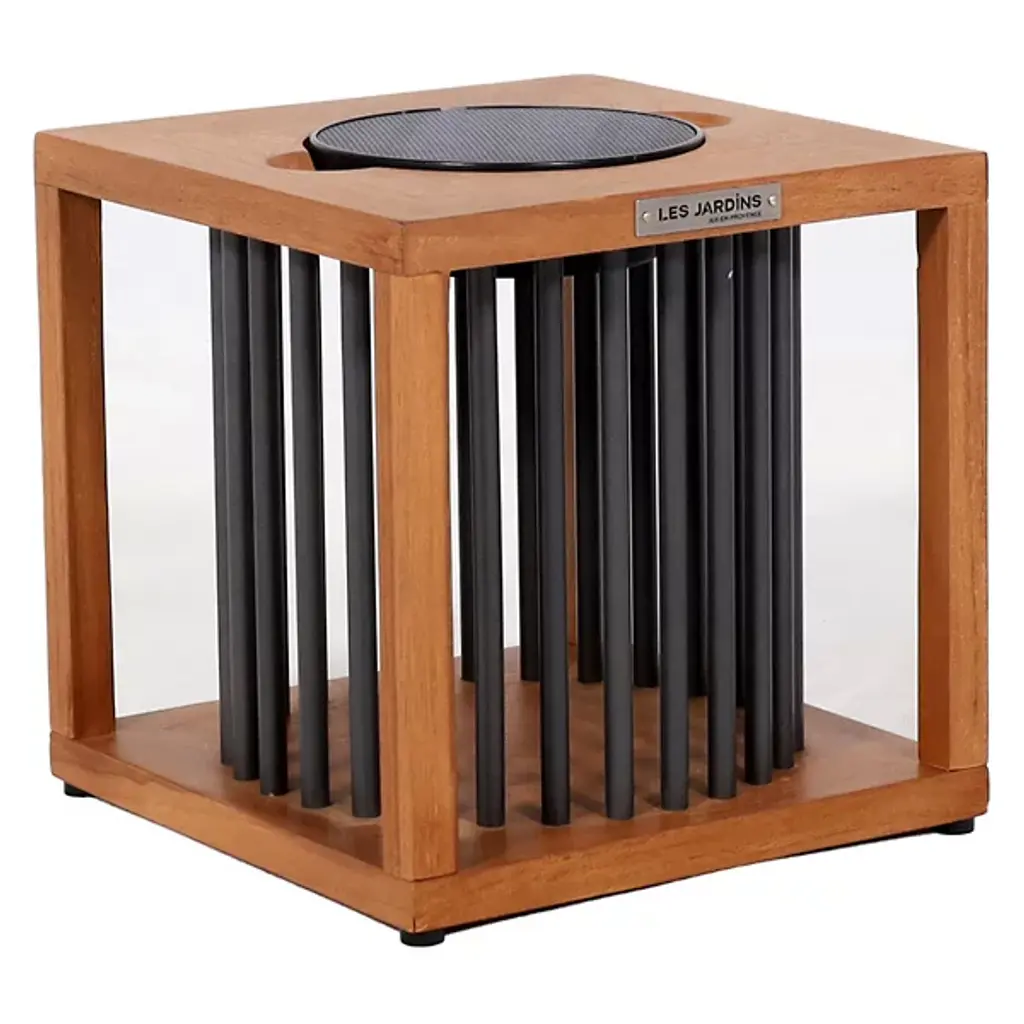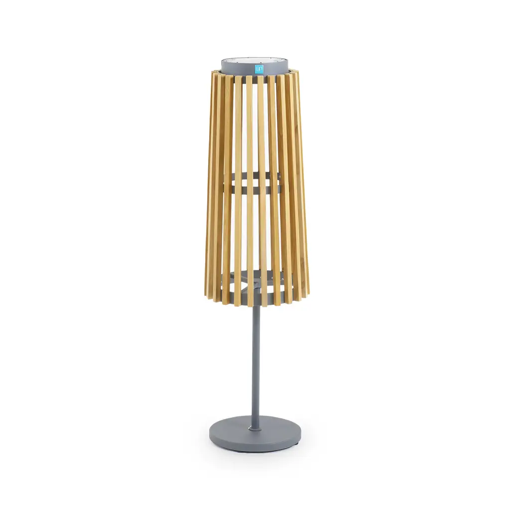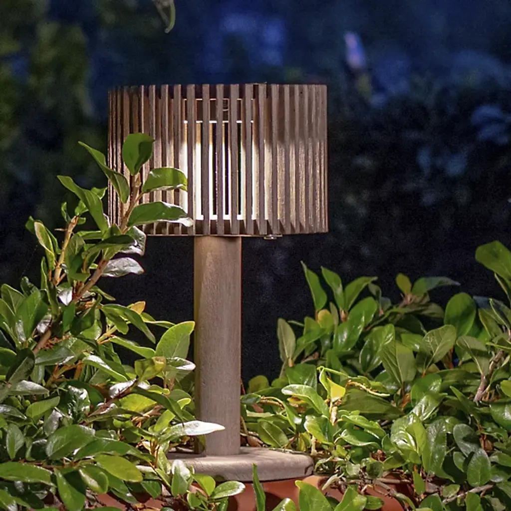 Chic, robust, cutting-edge. Enjoy an evening inside or outside while surrounded by the romantic light of the Pixy LED Outdoor Table Lamp from Les Jardins. Creator Les Jardins believes in the freedom to move about the world. Their work underscores one’s connection with space and light. These core tenets lend to the use of solar and USB tech to keep pieces like this powered anywhere. A teak wood construction keeps internal components protected with natural weather-resistant properties. The teak wood construction charms in its tight round shapes. The teak wood shade uses slates to disperse an even ambient glow and create an alluring pattern in silhouette. The lamp’s smart mode gives it enduring use by regulating luminosity.
