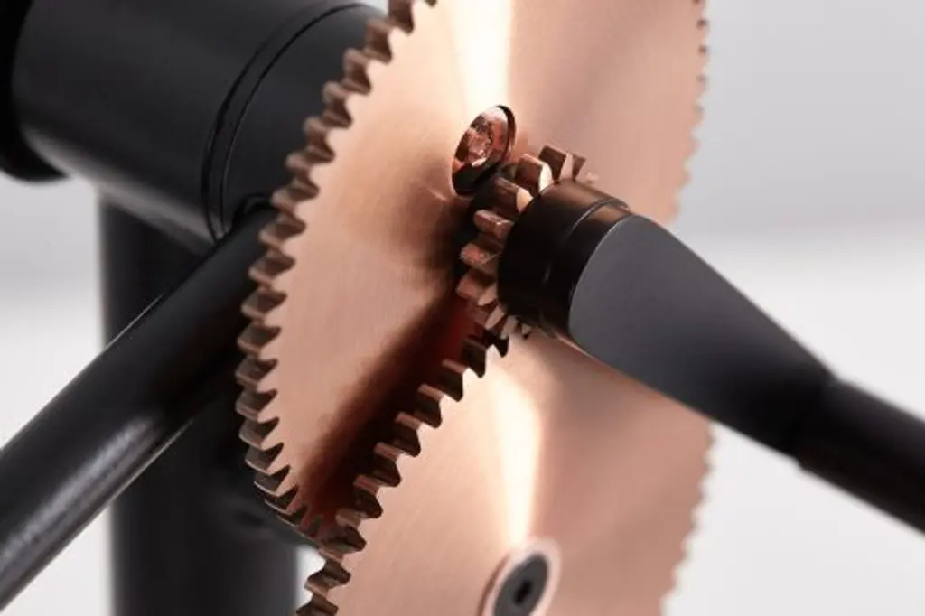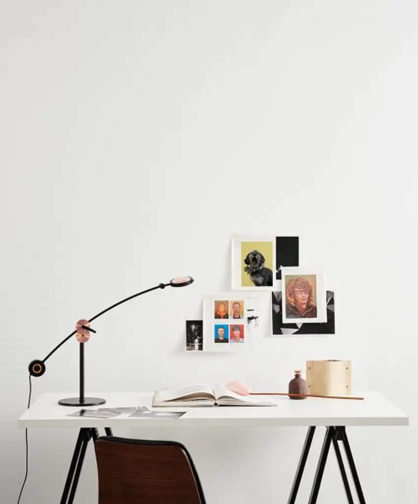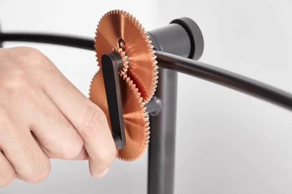 Innovative and creative, the Planet Table Lamp by Seed Design provides a dual function as a practical lighting device and a striking décor piece. The unique construction features multi-directional adjustable parts which bring more flexibility and convenience to a work table. A rotating handle moves the two copper gears, while a dimmer adjusts the light to suit any need. Made from steel and copper, the lamp is durable and refined at the same time. A lightly colored surface transforms the light into a warm glow, helping to create a welcoming and comfortable atmosphere inside any modern home. This Planet Table Lamp is also available in a larger floor version.
