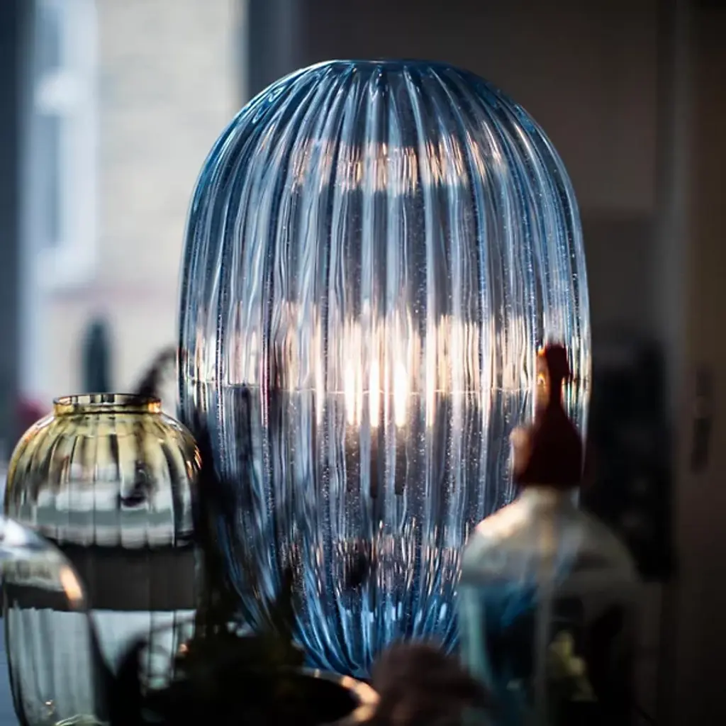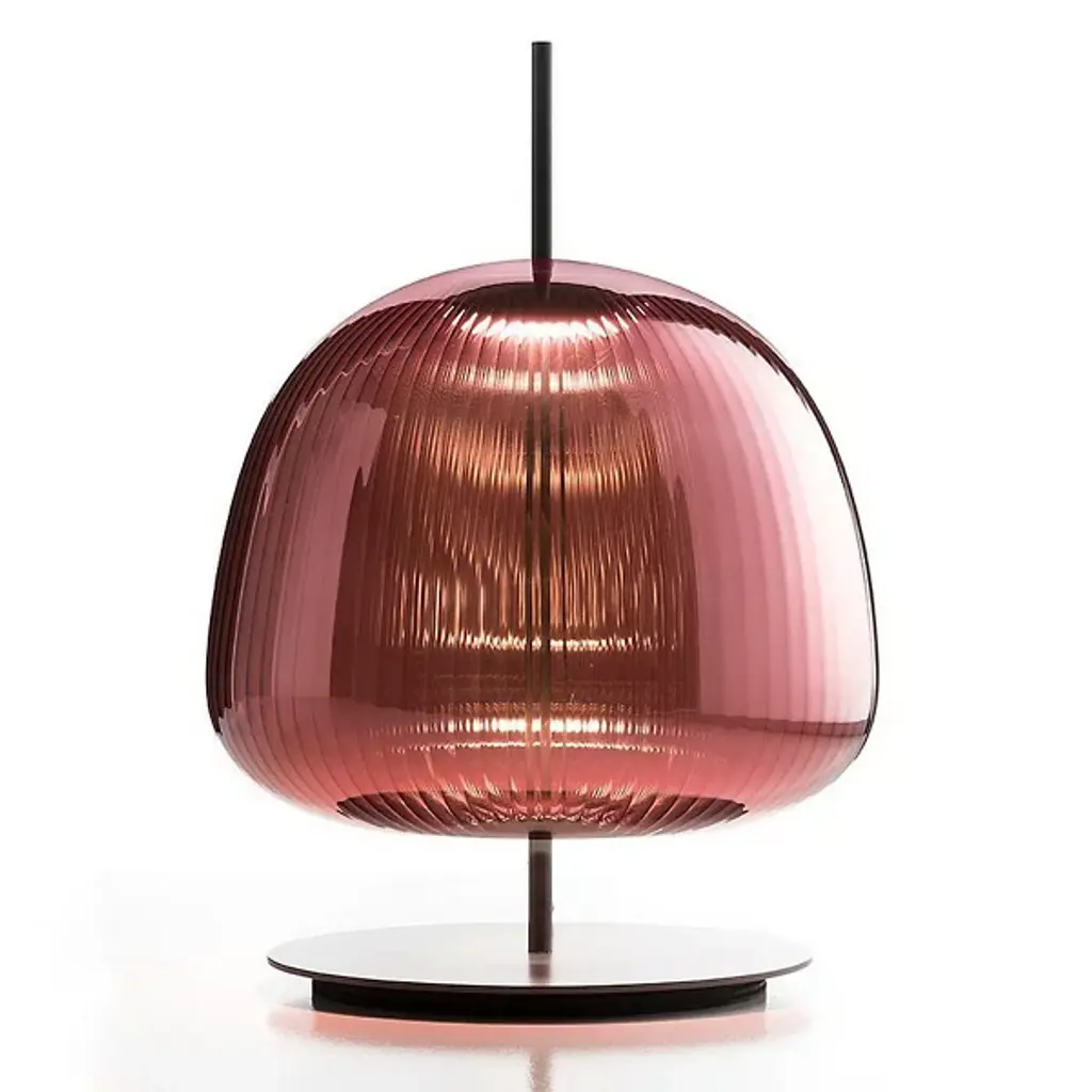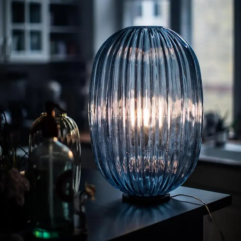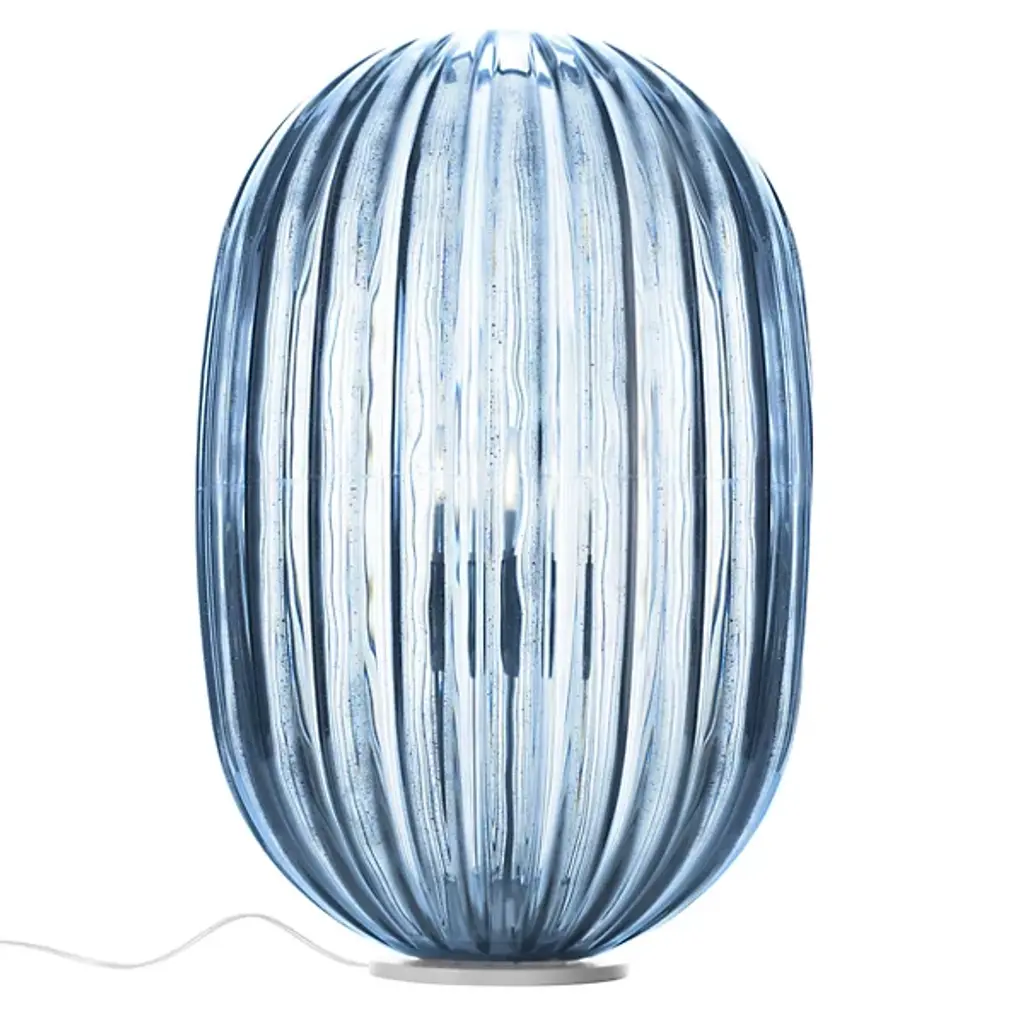 Inspired by Murano glass beads, the Foscarini Plass Table Lamp references the Venetian roots and material exploration of the Foscarini brand, creating a beautiful object with dazzling illumination. By rotationally molding polycarbonate, faceted ridges carve the oval shape, giving the appearance of hand-blown glass. The light resembles a lens flare when looking at the fixture, but the resulting shadow play around the fixture has a more fluid quality.