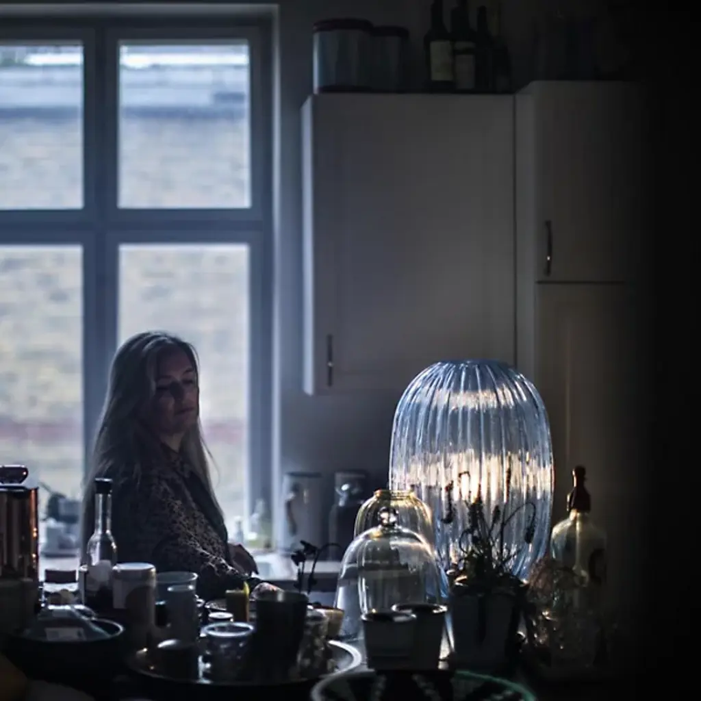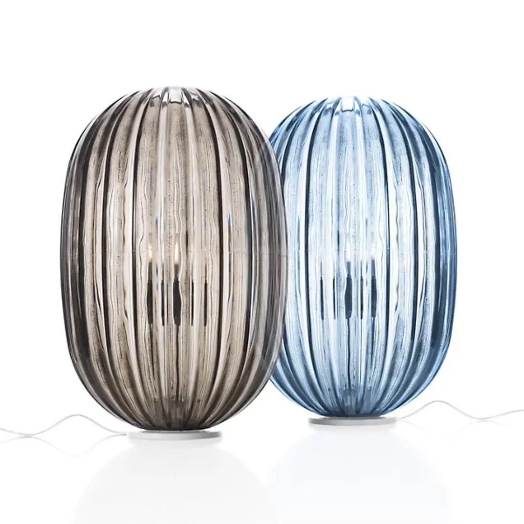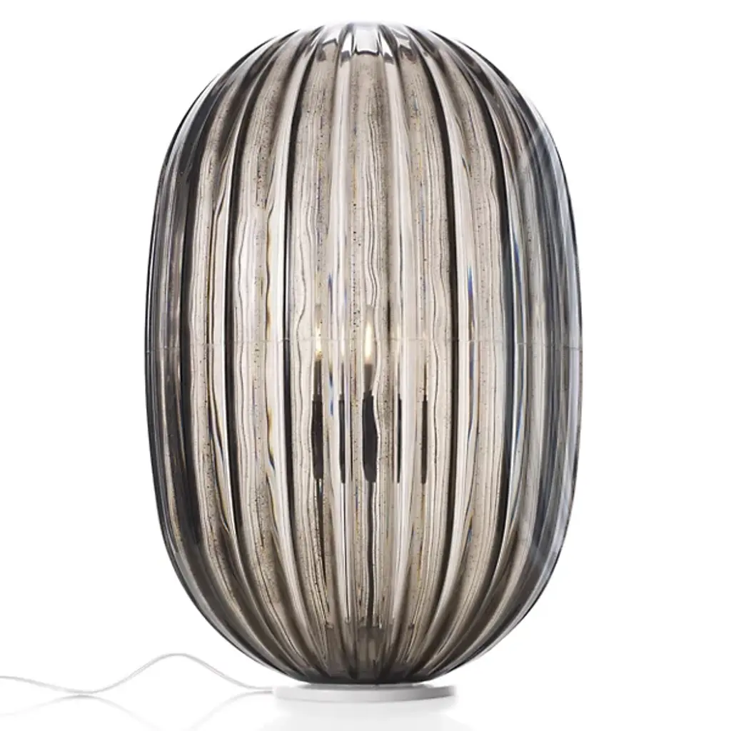 Inspired by Murano glass beads, the Foscarini Plass Table Lamp references the Venetian roots and material exploration of the Foscarini brand, creating a beautiful object with dazzling illumination. By rotationally molding polycarbonate, faceted ridges carve the oval shape, giving the appearance of hand-blown glass. The light resembles a lens flare when looking at the fixture, but the resulting shadow play around the fixture has a more fluid quality.