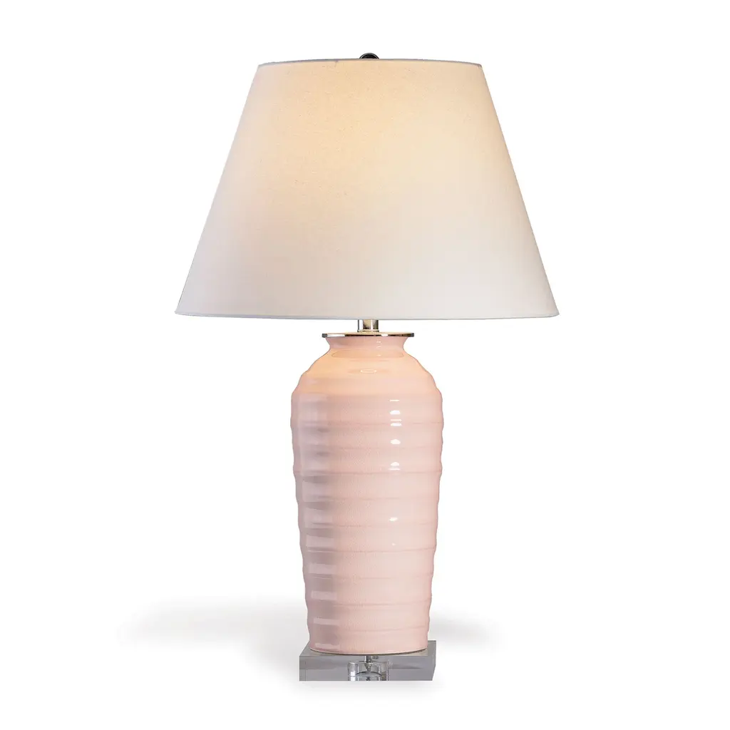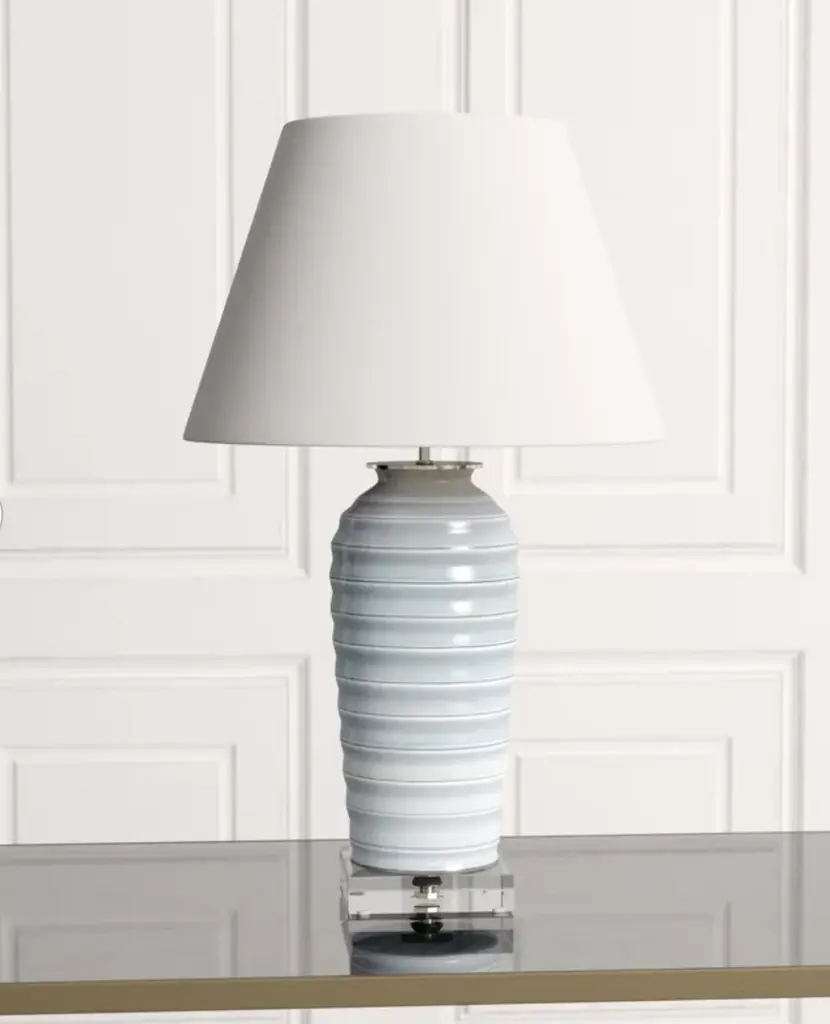 The modern, smoke color of the Playa Lamp is a subtle accent to any modern or casual interior. Perfect for the beach house or contemporary home. Featuring nickel hardware and a Lucite base. Also available in pink and ivory/white. Size: 31"H x 19"D Shade Material: Linen/cotton blend Shade Style: round empire hardback Nickel spider 3-way switch, 150 watt max bulb Material: Porcelain/Linen/Cotton Ships via UPS Free shipping in the U.S.