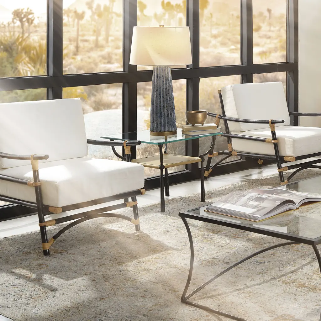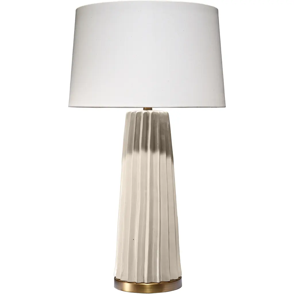 The simple lines of this cornflower blue ceramic lamp are elevated with a unique pleated effect inspired by Japanese streetwear. We keep the fashion-forward look sleek with the addition of a tapered, rolled edge linen shade. A metal base and trapezoidal finial, both with a gleaming antique brass finish, add just a touch of shine. At once modern and timeless, this is a look that will always be in style.
