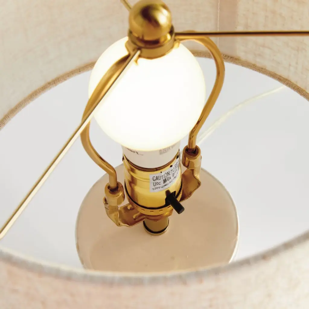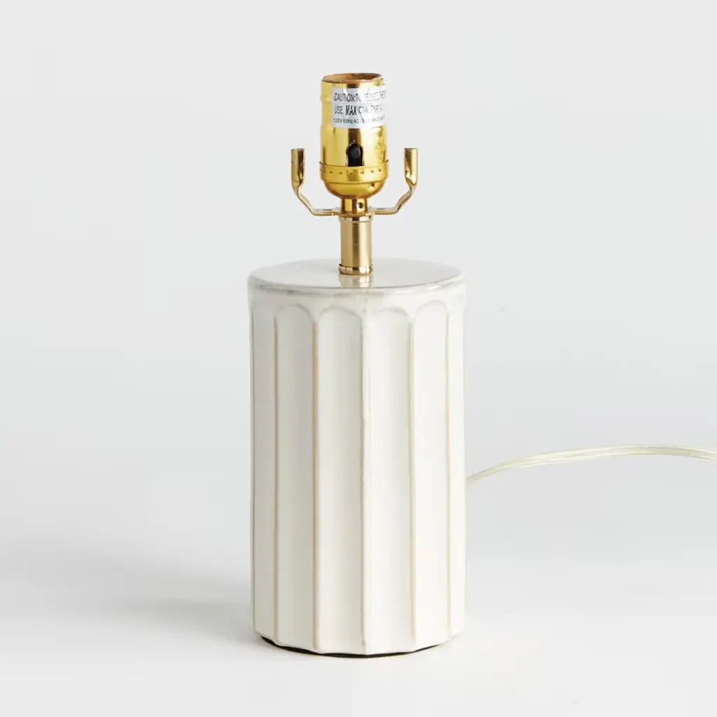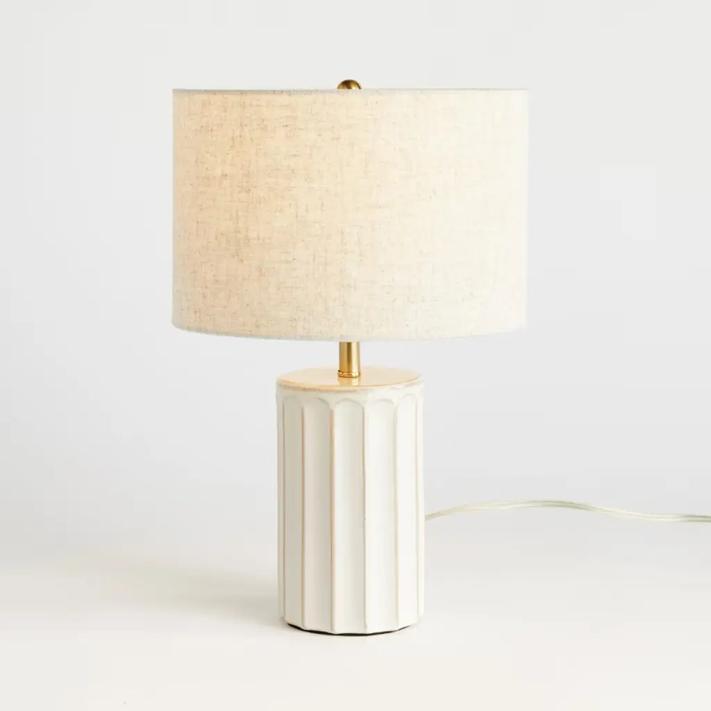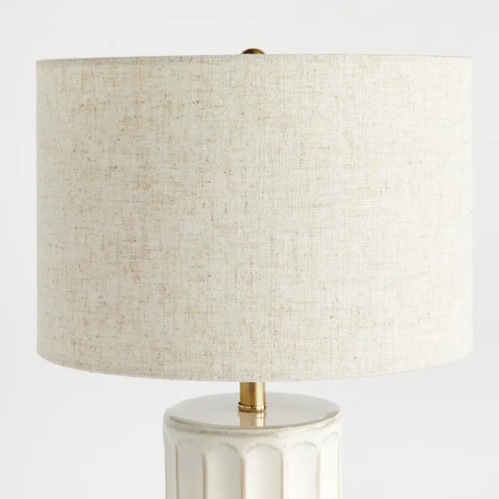 With a wide, repeating ribbed pattern and antiqued reactive glaze, this lamp brings the character. The well-scaled linen shade and matte finish complete the look. Perfect for console, bookshelf or desk to brighten any space.