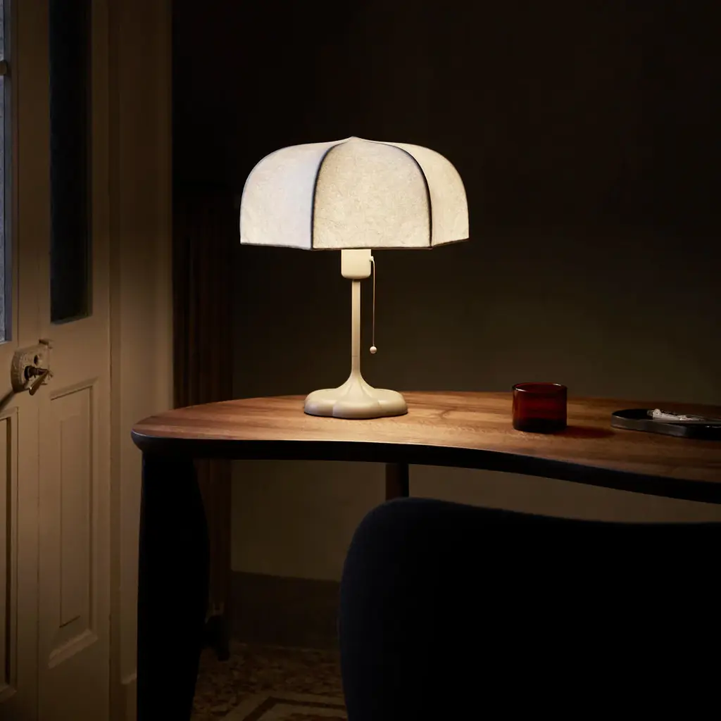 Drawing inspiration from the opulent details found in Baroque art and architecture, the Poem Table Lamp has a romantic and elegant expression. Made through an intricate process where liquid tissue is sprayed over the lamp's casted aluminum base, the result is a translucent shade that artfully stretches over intricate steel arches, ensuring that the lamp emits a soft, diffused light while resembling a delicate flower. The non-woven polymer shade will beautifully patinate over time, giving it a unique appearance. Place the Poem on your bedside table or let it elegantly illuminate your desk.