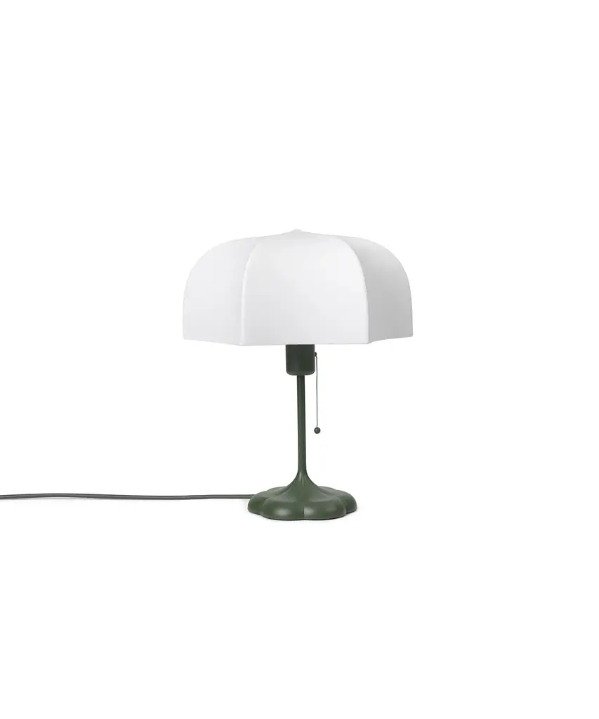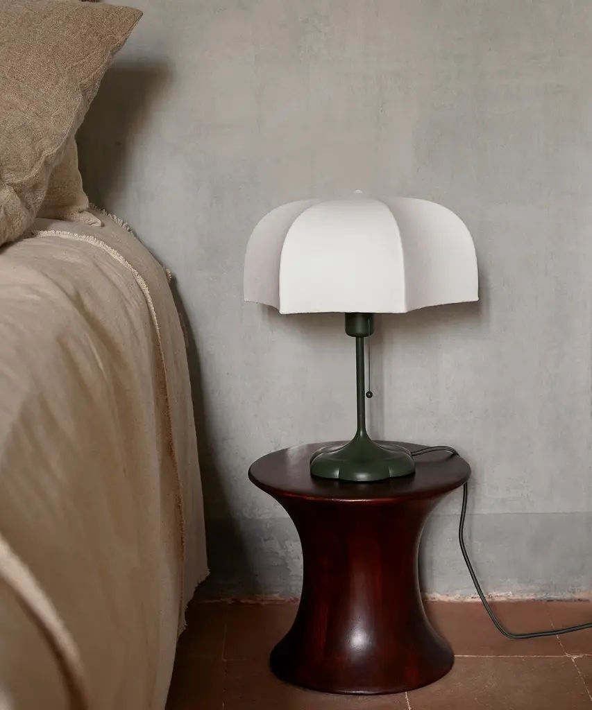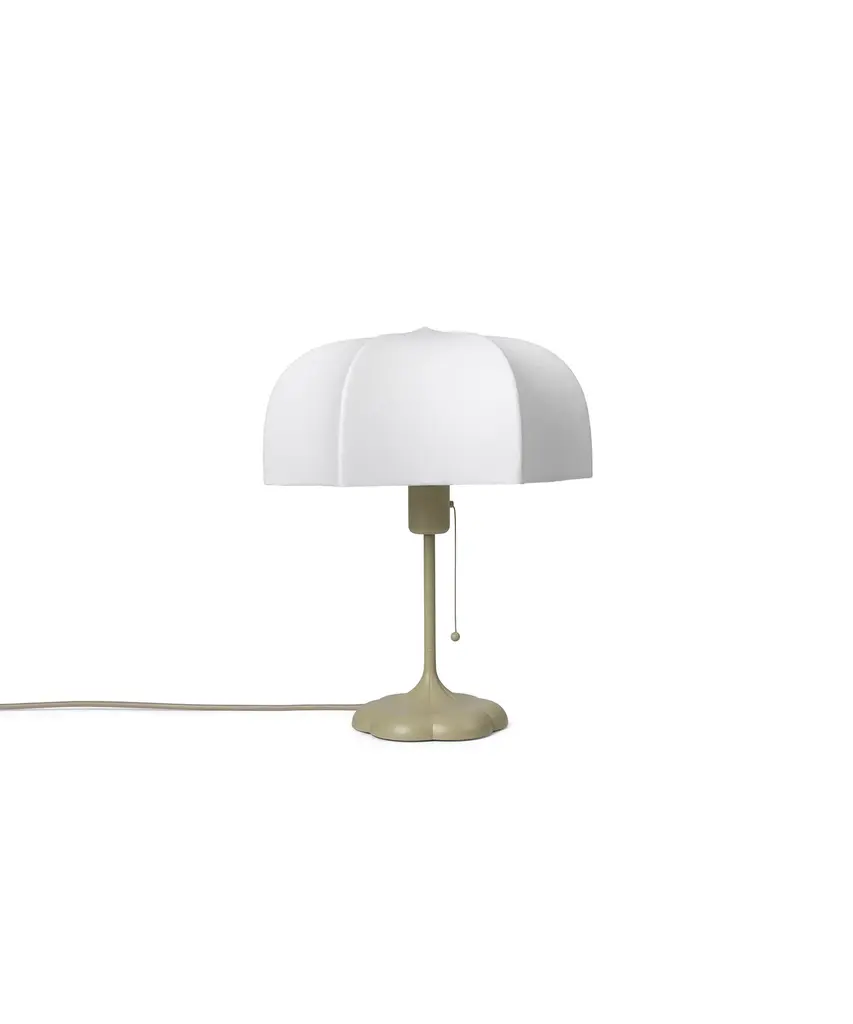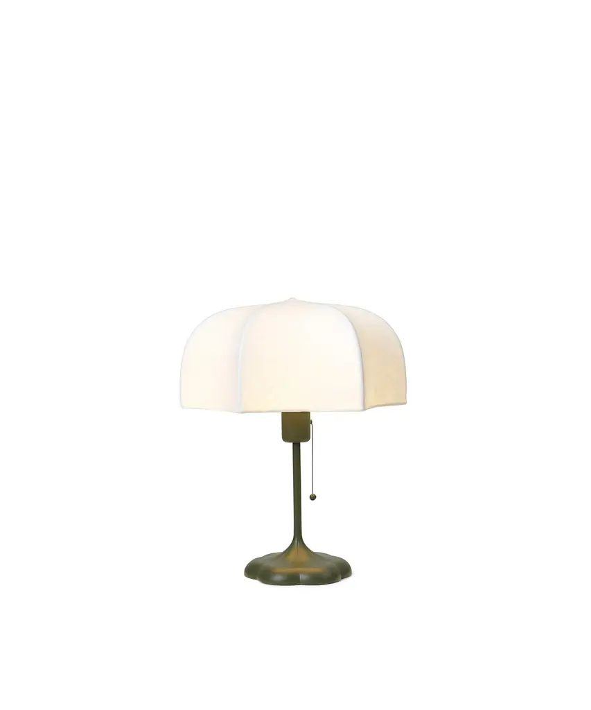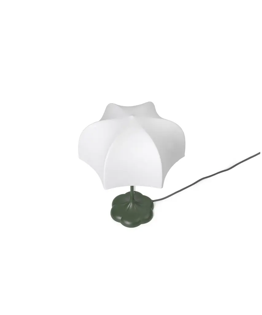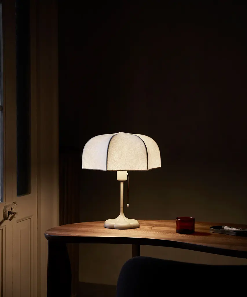 Drawing inspiration from the opulent details found in Baroque art and architecture, the Poem Table Lamp has a romantic and elegant expression. Made through an intricate process where liquid tissue is sprayed over the lamp's casted aluminum base, the result is a translucent shade that artfully stretches over intricate steel arches, ensuring that the lamp emits a soft, diffused light while resembling a delicate flower. The non-woven polymer shade will beautifully patinate over time, giving it a unique appearance. Place the Poem on your bedside table or let it elegantly illuminate your desk. Designed and produced by the Copenhagen-based studio Ferm Living.