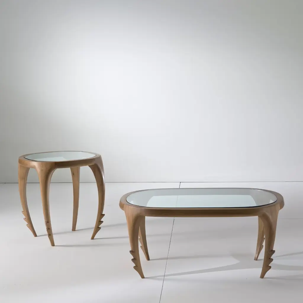 Just like a real hunting dog, the Pointer small table by Nigel Coates seems to be ready to move: its wood legs have a slightly bent shape that grows thinner from the rectangular glass top to the base. At the bottom of each of the legs, three prominences seem to be reminiscent of the shaggy fur of a hunting dog at the moment when it smells the prey. Pointer LampTable is finished in solid walnut