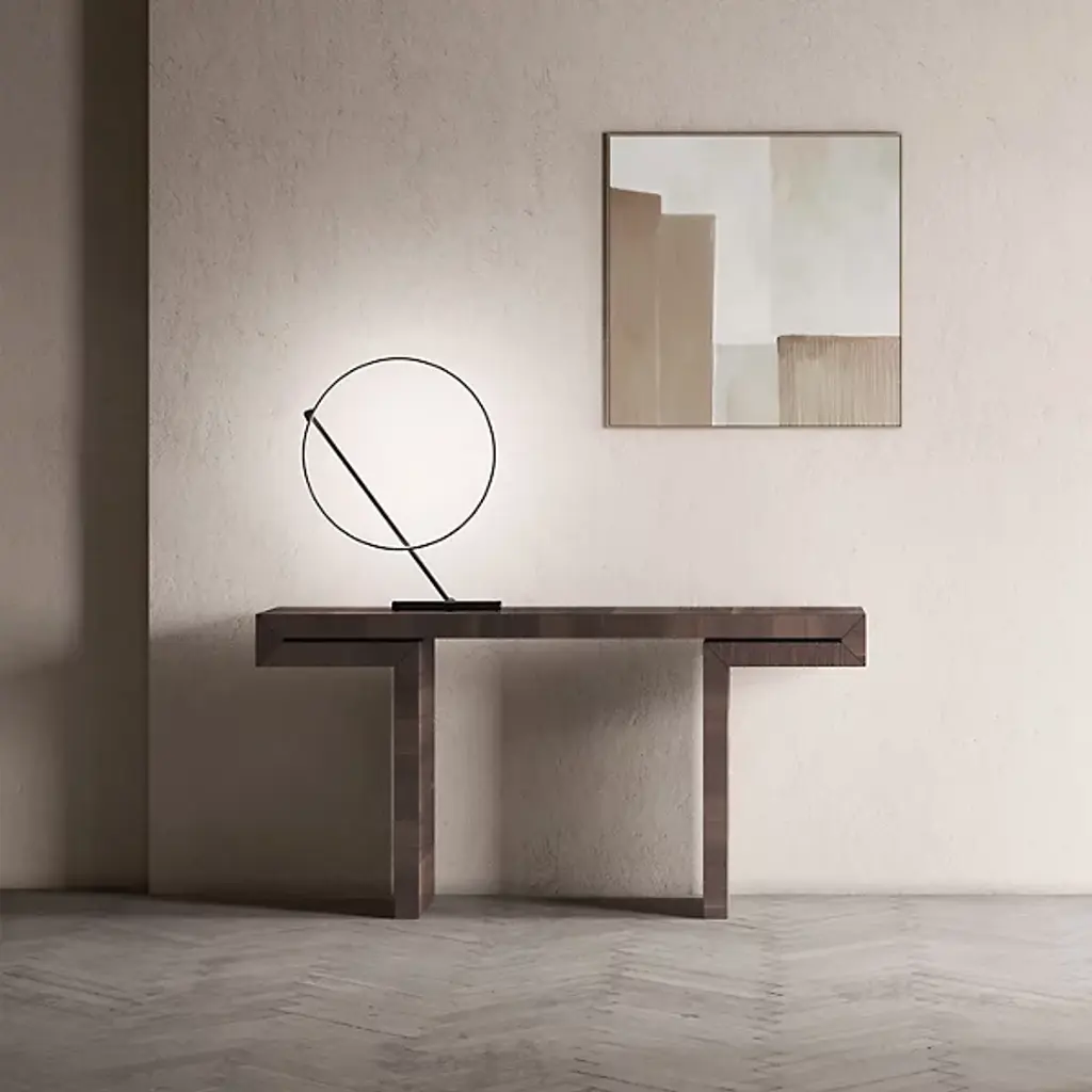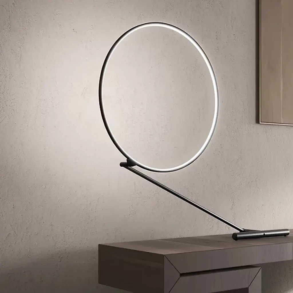 The Poise LED Table Lamp by Kundalini offers an open, minimalist appeal to inside tables, workspaces, or even a bedside table. Rising from a rounded base along a slender, adjustable stem, it’s equipped with a dimmer setting on its cord and terminates in posable LED lamping placed inside an open hoop structure. This flexibility means the lamping can be set above a project for more direct light or pulled back further to provide a more ambient illumination to its surroundings.