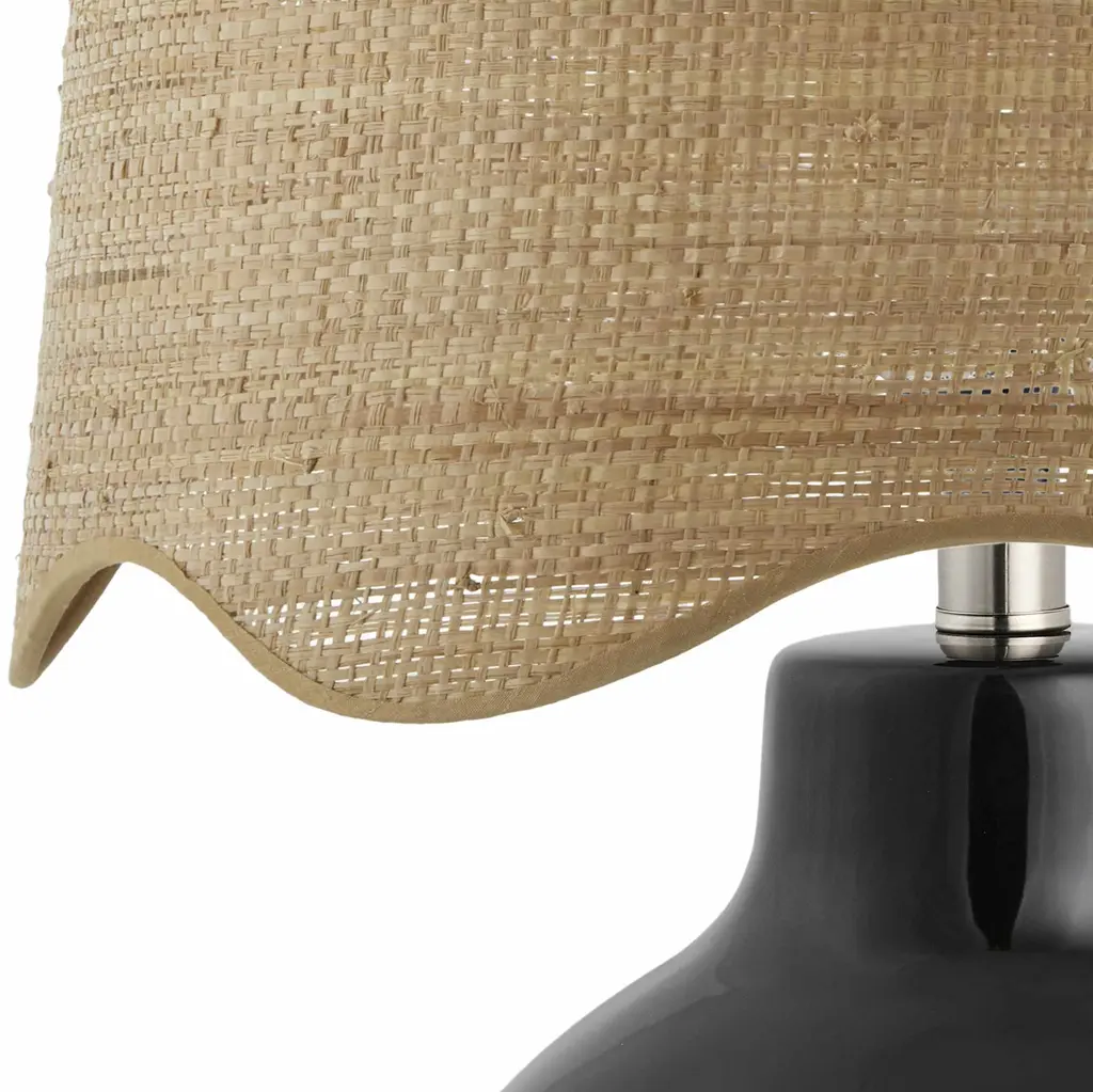 Collection: Pojezerje Colors: Black, Peach, Translucent Material: Body: Ceramic,Shade (Outside): Rattan,Shade (Inside): Metal Styles: Southwestern Made In: China Lighting Type: Accent Table Lighting Shade Material: RattanMetal Shade Color: WheatWheat Cord Length: 6' Switch Type: On/Off Number of Bulbs: 1 Socket Type: E-26 Bulb Wattage: 100W