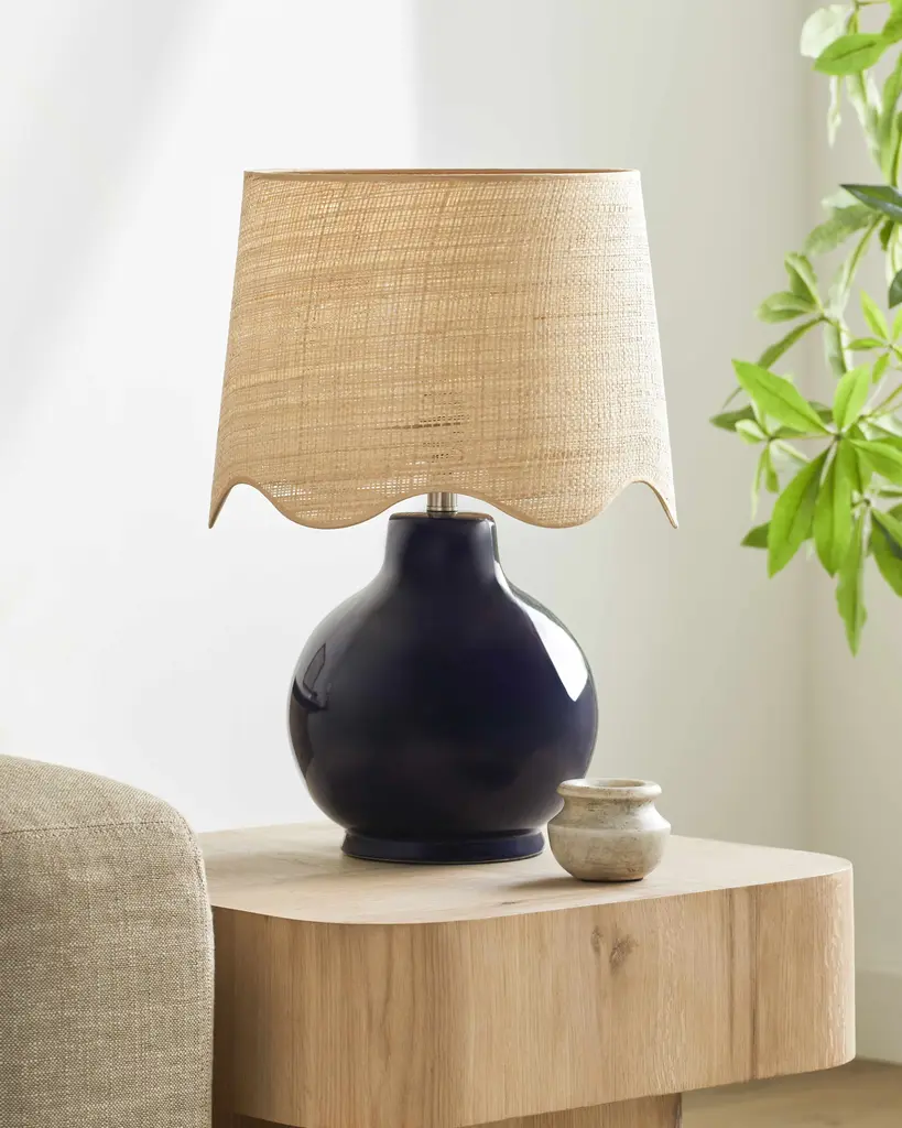 Collection: Pojezerje Colors: Navy, Peach, Translucent Material: Body: Ceramic,Shade (Outside): Rattan,Shade (Inside): Metal Styles: Southwestern Made In: China Lighting Type: Accent Table Lighting Shade Material: RattanMetal Shade Color: WheatWheat Cord Length: 6' Switch Type: On/Off Number of Bulbs: 1 Socket Type: E-26 Bulb Wattage: 100W