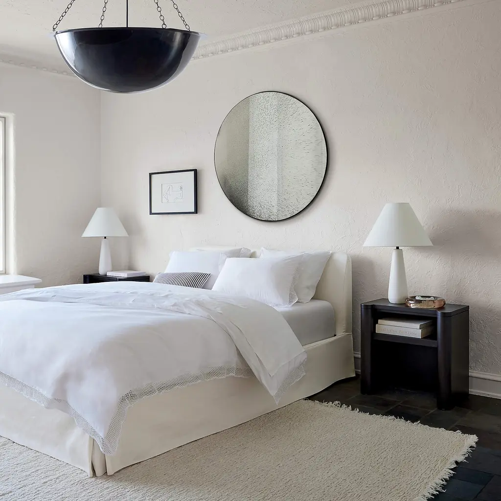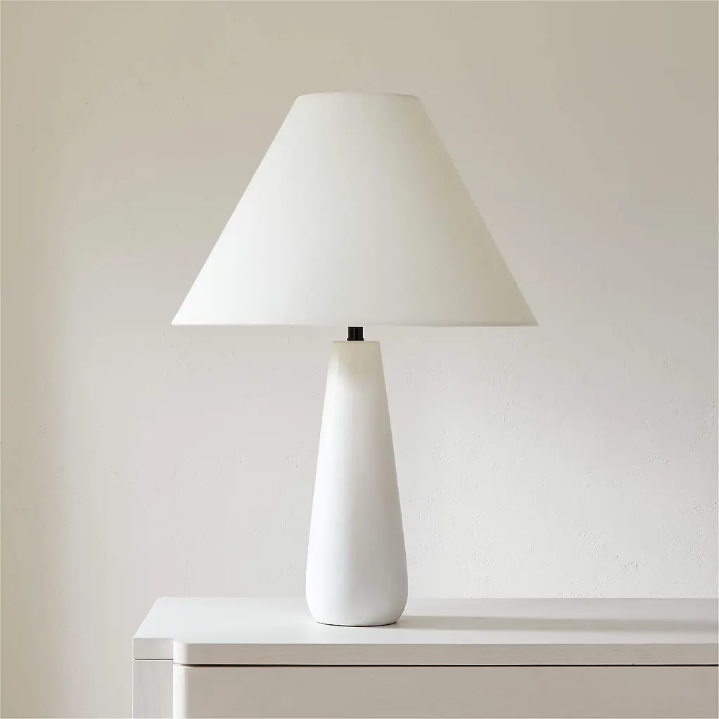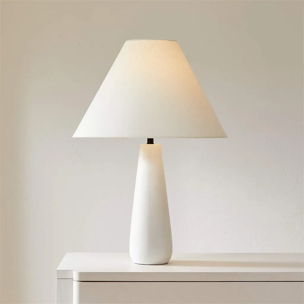 Monochromatic table lamp stands on a solid ivory concrete base that tapers to an ivory linen shade. "We're really pushing the limits in terms of scale," explains designer Kara Mann. "We love the more substantial shades." Lamp gives off a soft light, perfect for warming up any space. CB2 exclusive.