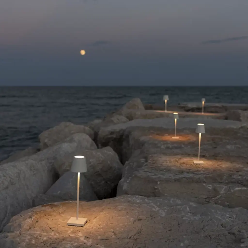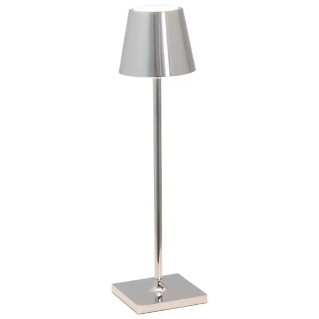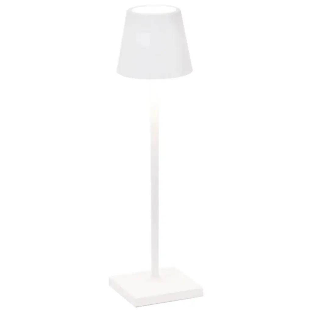 The Poldina Micro Rechargeable LED Table Lamp from Zafferano America reflects Federico De Majo's approach to portable Italian lighting through its slender profile and cordless functionality. De Majo developed this piece to provide seven hours of continuous illumination on a single charge, making it suitable for both indoor and outdoor use. The polycarbonate diffuser distributes LED light evenly, while full-range touch dimming allows users to adjust brightness levels. A rechargeable lithium-ion battery eliminates cord dependency, while tunable white technology lets you shift between warm and cool color temperatures.