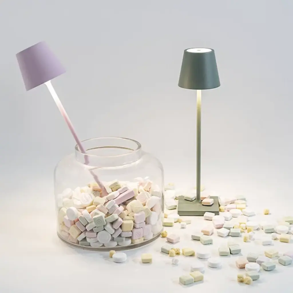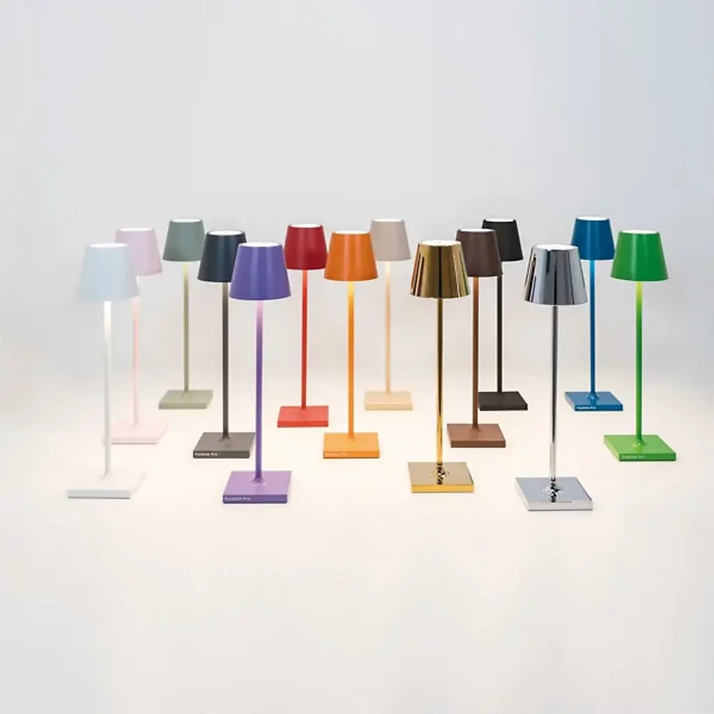 The Poldina Micro Rechargeable LED Table Lamp from Zafferano America reflects Federico De Majo's approach to portable Italian lighting through its slender profile and cordless functionality. De Majo developed this piece to provide seven hours of continuous illumination on a single charge, making it suitable for both indoor and outdoor use. The polycarbonate diffuser distributes LED light evenly, while full-range touch dimming allows users to adjust brightness levels. A rechargeable lithium-ion battery eliminates cord dependency, while tunable white technology lets you shift between warm and cool color temperatures.