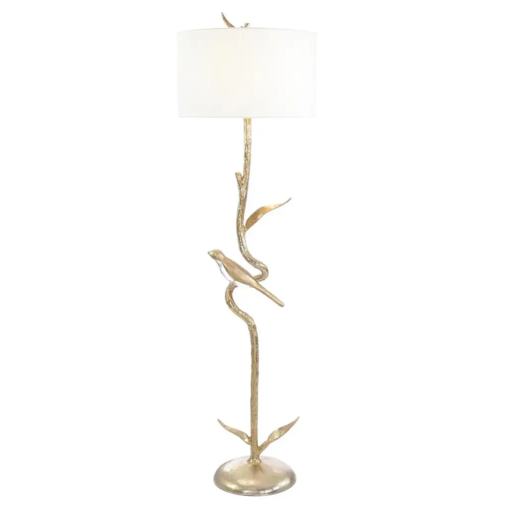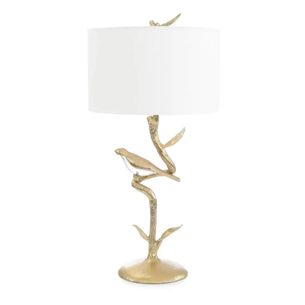 The Poleiro Table Lamp is a stunning translation of nature’s beauty through the lens of modern design. Crafted from metal in a champagne gold finish, this three-way turnkey lamp takes the form of a gorgeous, naturally shaped sapling with delicate leaves sprouting from the sides. A small bird, also in champagne gold, features an acrylic underside resulting in a tasteful juxtaposition of hues. A rounded base and leafy finial complete the look of this exciting statement piece.