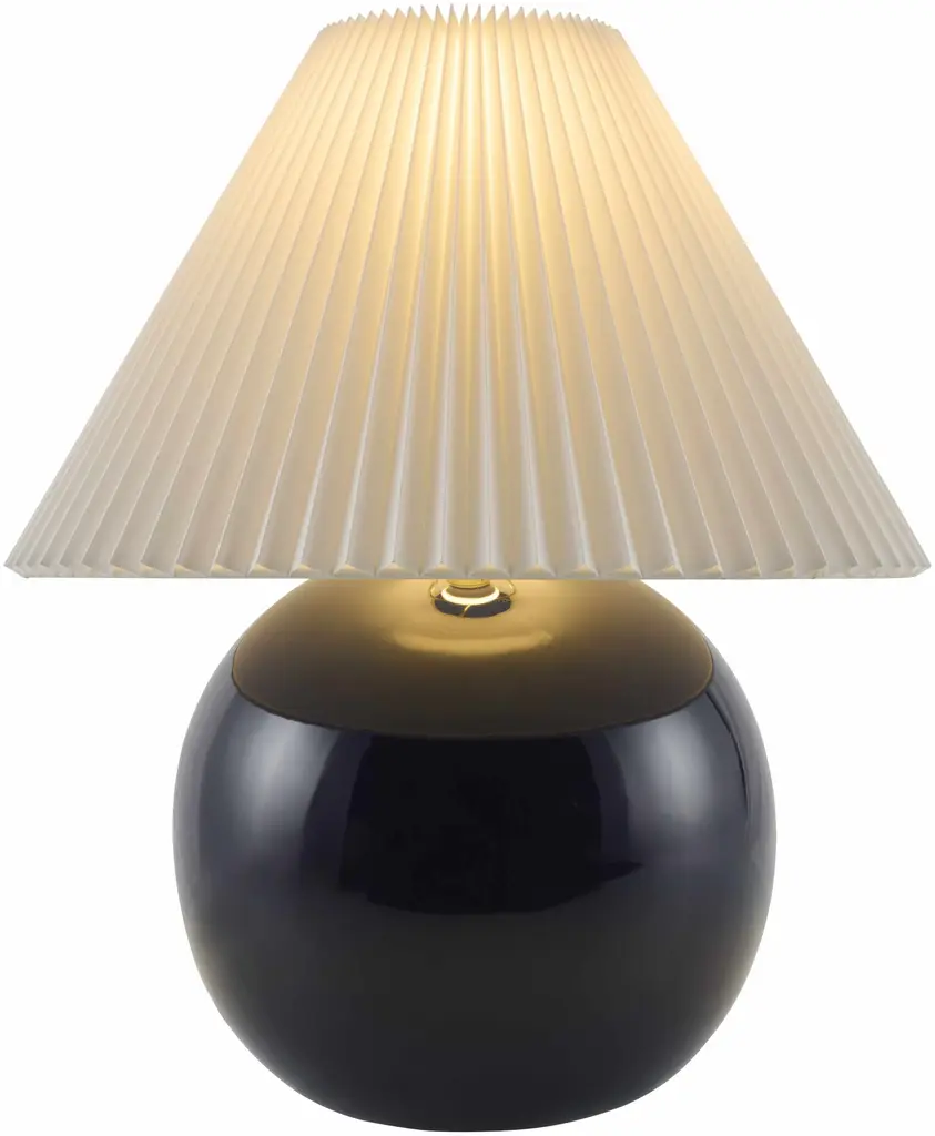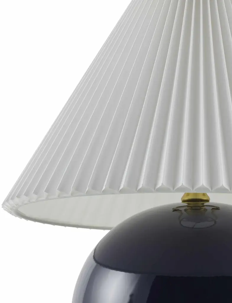 Collection: Policarpa Colors: Navy, White, Metallic - Brass, Translucent Material: Body: Ceramic / Shade (Outside): Polyester / Finial: Iron Styles: Traditional Made In: China Lighting Type: Accent Table Lighting Shade Material: Polyester Shade Color: White, White Cord Length: 6' Switch Type: On/Off Number of Bulbs: 1 Socket Type: E-26 Bulb Wattage: 100W