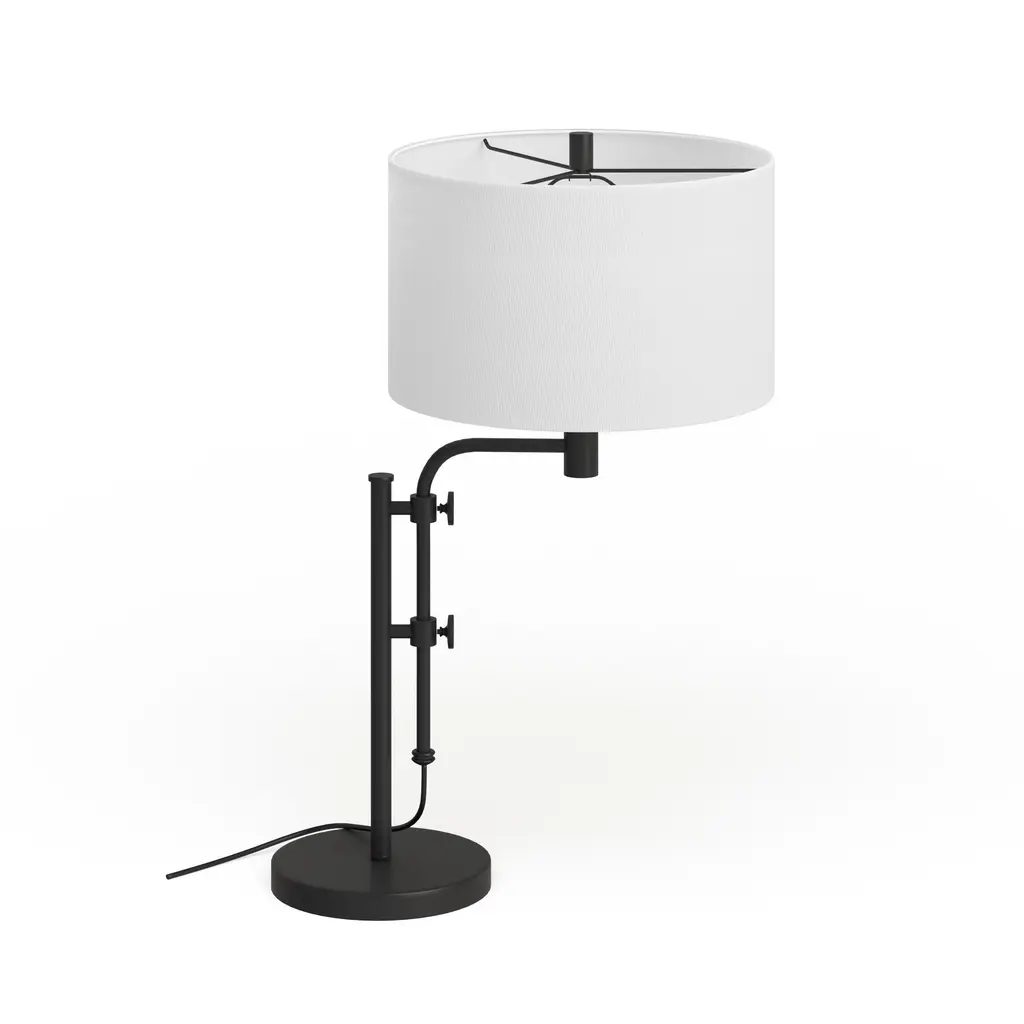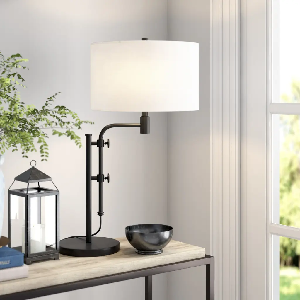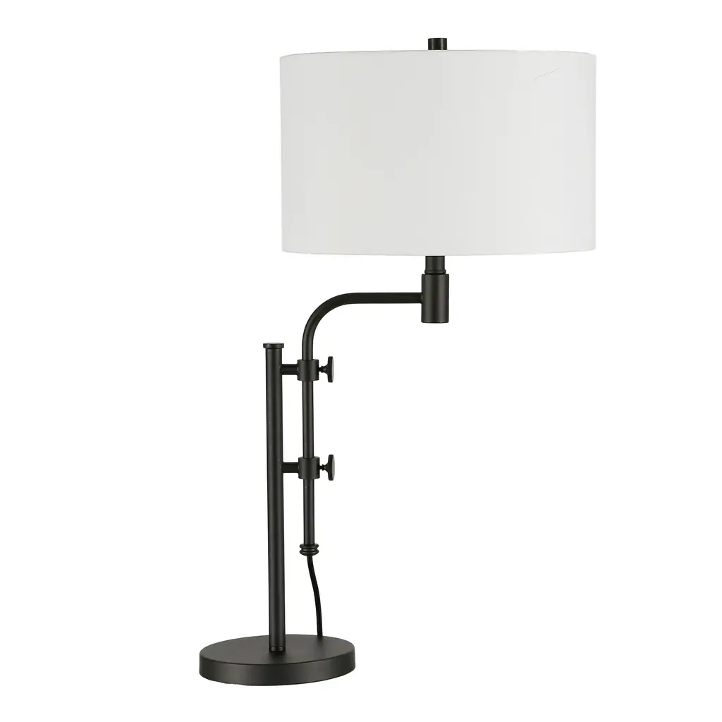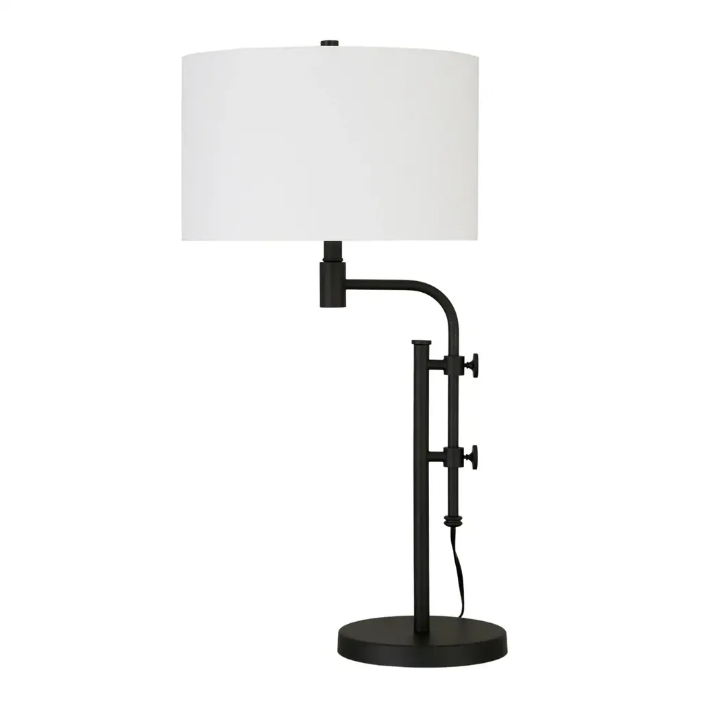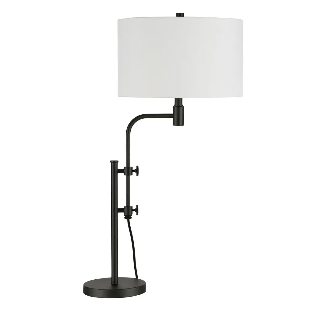 Industrial ingenuity makes for a showy accent piece in this irresistible table lamp. A round, crisp fabric shade balances atop an adjustable base for a smooth, sleek look. The artful dimension and texture of the lamp base brings a factory feel updated with a touch of style for a wonderfully unique addition to any space.Features: