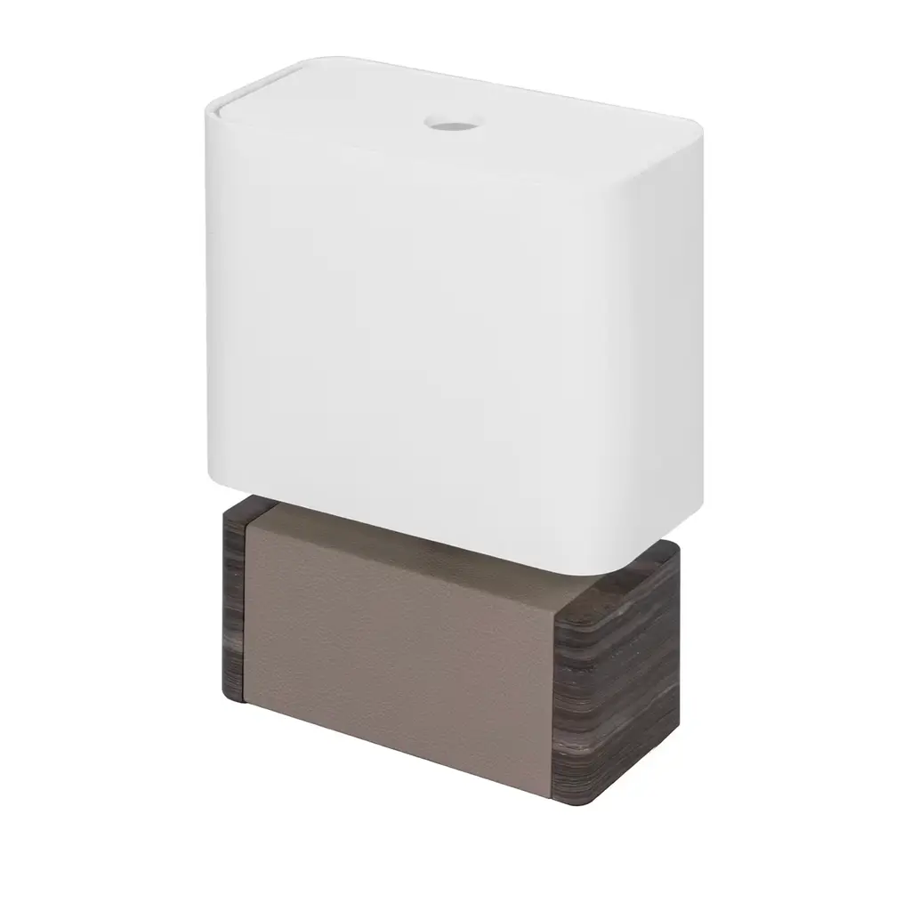 This exquisitely detailed table lamp is a work of art that stands out for its well-proportioned volumes and prized materials. Infusing any interior with timeless elegance, the black leather rectangular base is accented on the sides with Black Portoro marble while the white cotton lampshade boldly rises to create a compact, geometric silhouette. Equipped with fireproof diffuser and an in-line footswitch, the light is provided by one E14 light bulb max 100W (not included). Available also with Arabescato White, Eramosa Brown, Green Guatemala, and Travertino. Size can be customized upon request.