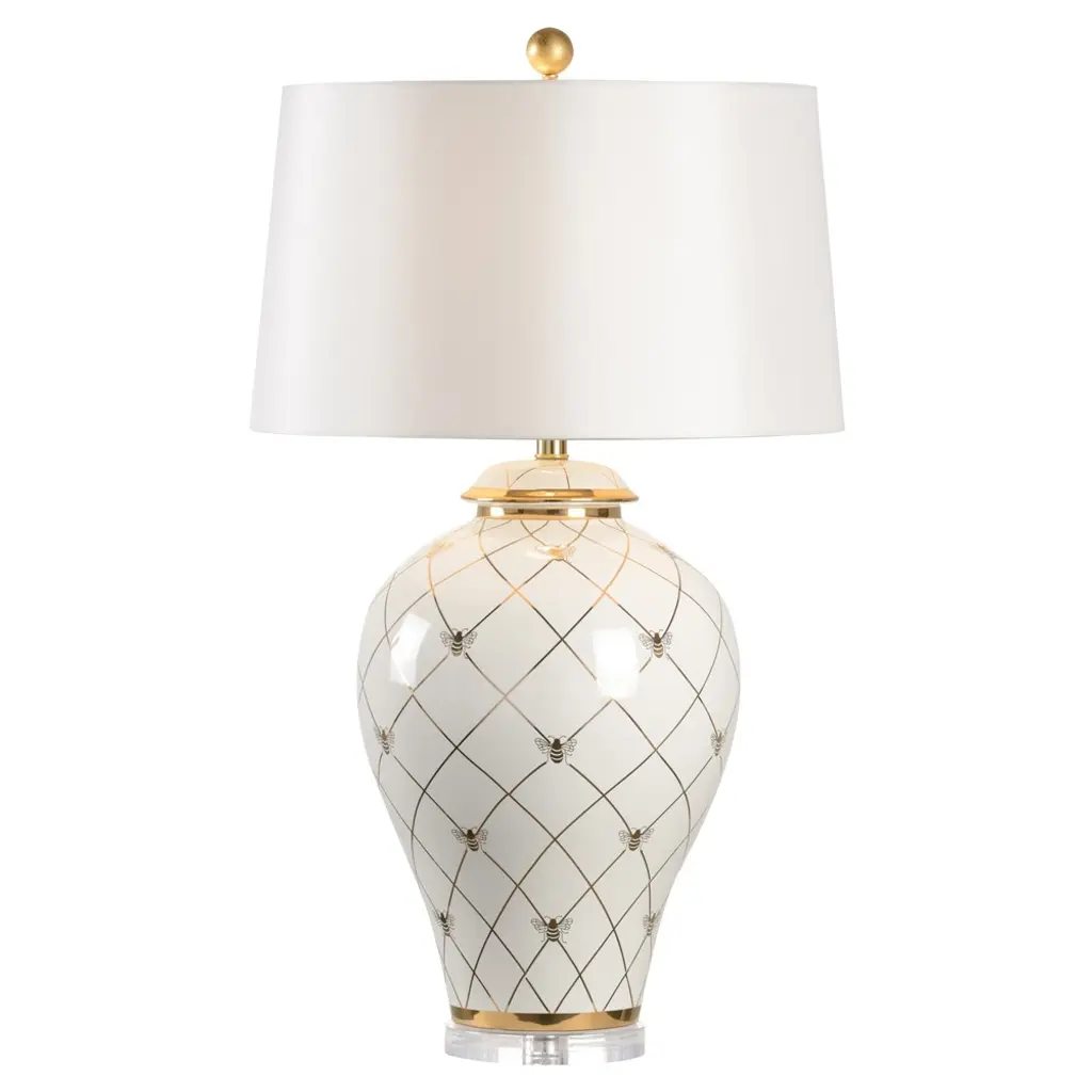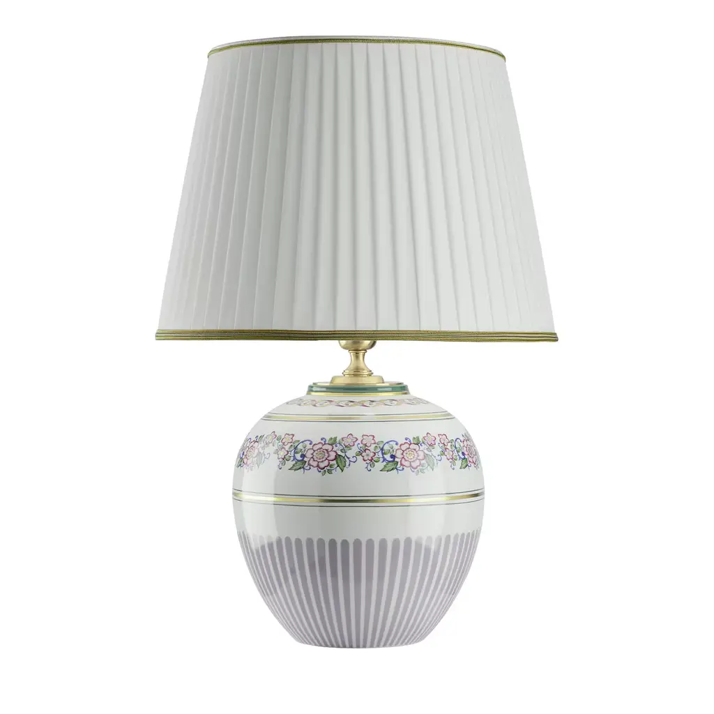 This lavish table lamp's porcelain body is rich in ornate details, romantic floral motifs painted in polychrome shades, and warm profiles covered in brushed, pure gold. The classic pleated lampshade houses a single E27 max 60W bulb and filters the light for even, balanced illumination of the surroundings.