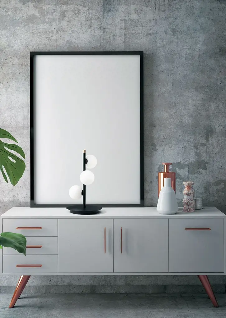 Pomì is a 3-light table lamp in milky white blown glass and black painted or brushed brass frame. The lamp is equipped with a dimmer.Technical information:- Light source: G9- Power: 3 x max 40w- Dimmer