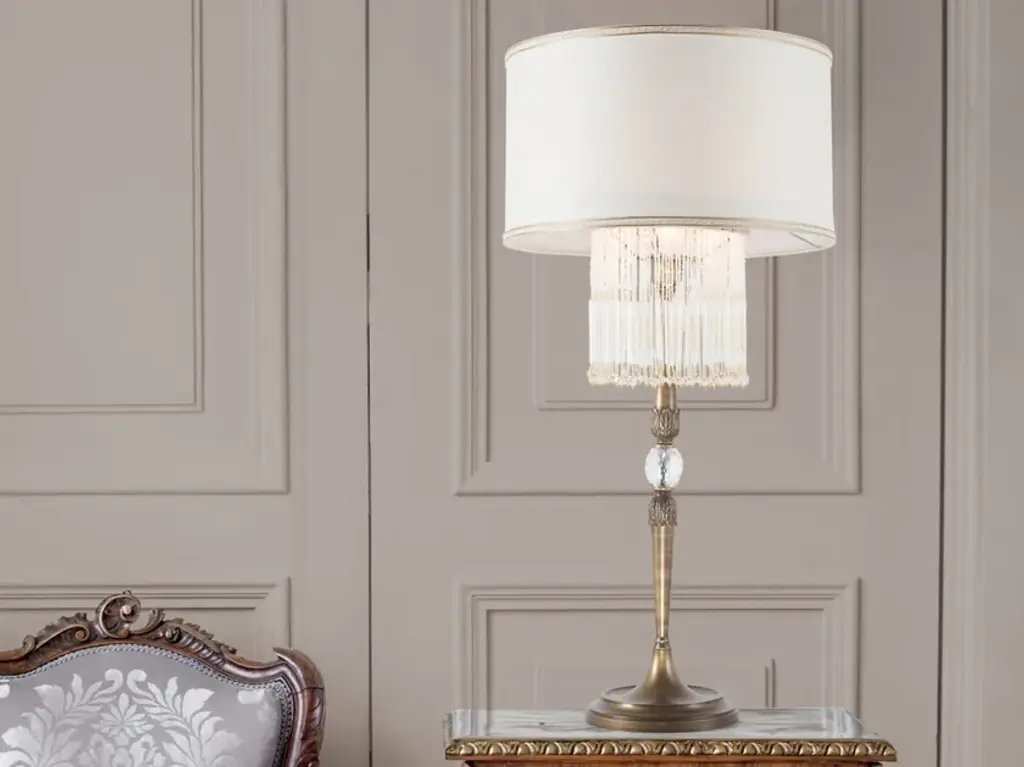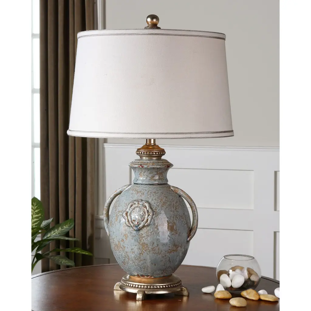 Classically Dressy and Designed with Loads of Charm the Pompadour X Table Accent lamp by Lucas McKearn is 31" in height and the widest part of the shade is 9". Using the x marks in silver on the shade to add a traditional flair and the molded hand finished Duck feet to add a little bit of Whimsical appeal, this New Orleans inspired Accent Lamp will add an Aire of Sophistication to your space. Neutral Finishes and a mix of glam always brings the best look to any space.