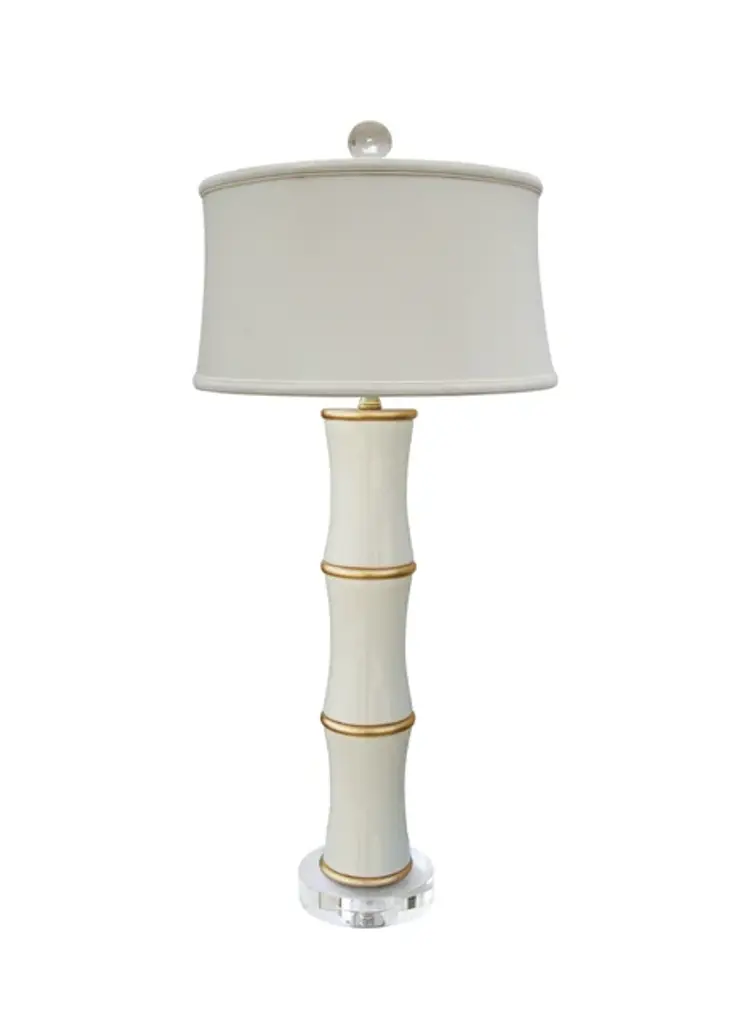 This timeless, lustrous french blue porcelain lamp is adorned with gold bamboo detailing atop a luxe crystal base and top. This bold and versatile piece adds a luxurious, chic touch in any room. Comes topped with a white shade.