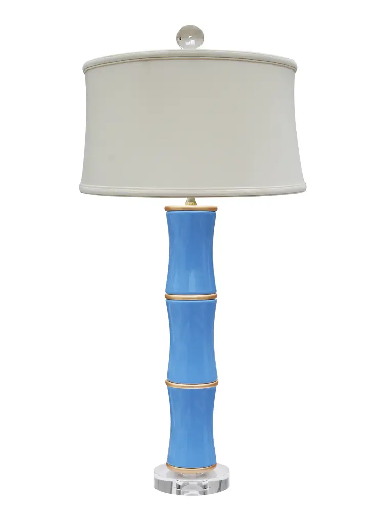 This timeless, lustrous french blue porcelain lamp is adorned with gold bamboo detailing atop a luxe crystal base and top. This bold and versatile piece adds a luxurious, chic touch in any room. Comes topped with a white shade.