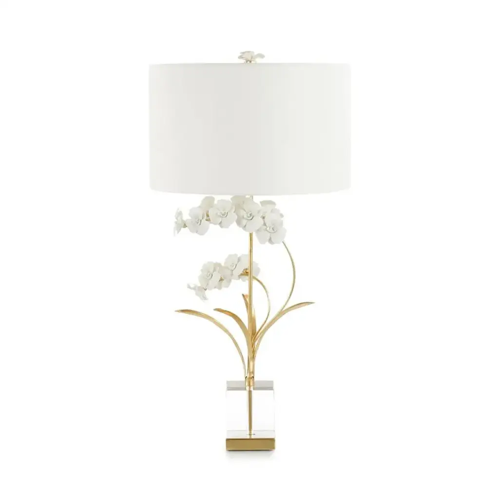 The Porcelain Petals Table Lamp is a stunning interpretation of natural motifs through the lens of modern design. Gorgeous porcelain petals are realized in intricate detail, supported by thin brass stems in Gold Leaf. The piece rests atop a base of clear crystal with brass accents. Polished Brass neck hardware and a floral porcelain finial complete the look of this table lamp with a three-way switch.
