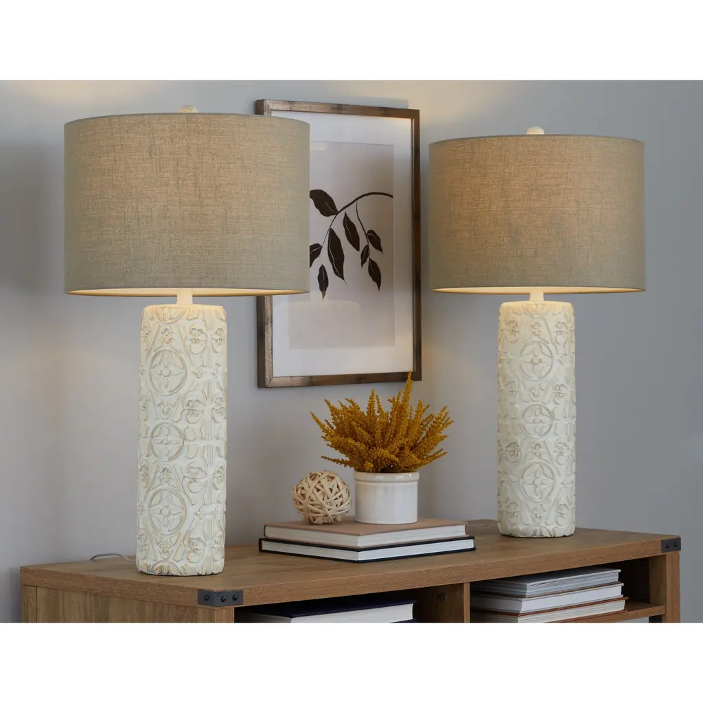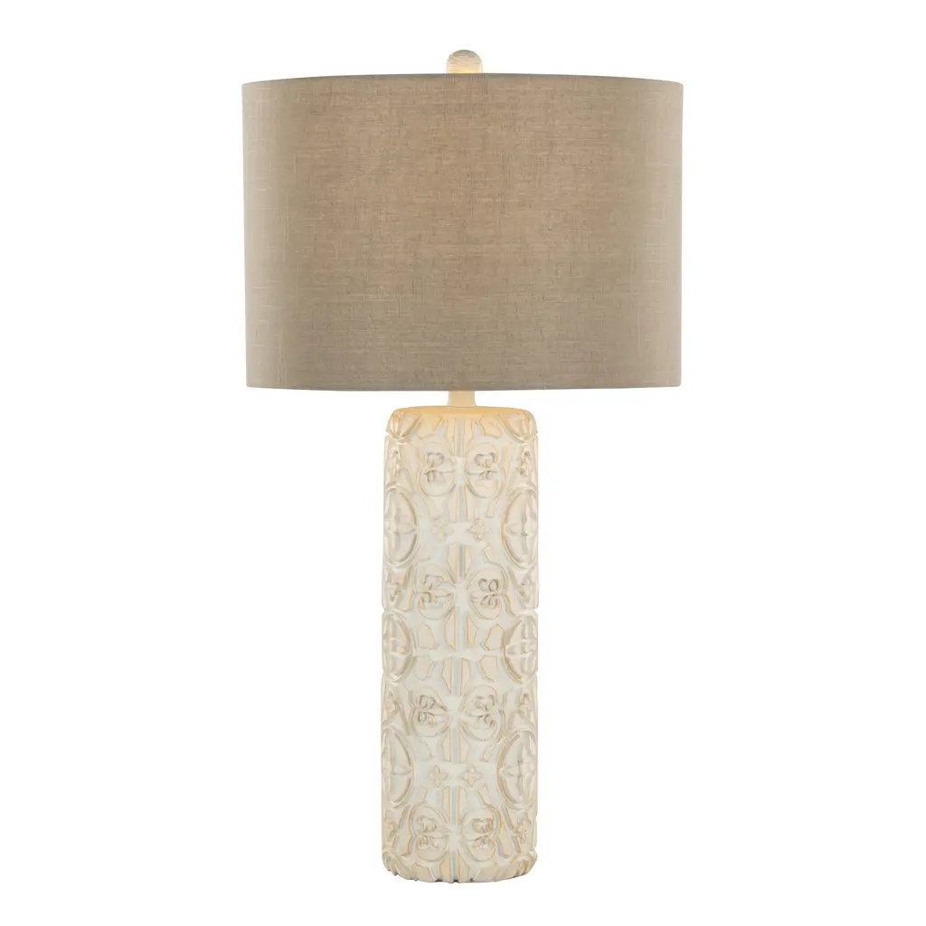 Add eye-catching style to your space with the gorgeous Charlotte Table Lamp. The cylindrical polyresin base features an intricately carved pattern, a matching finial, and a linen drum shade. This is a beautiful piece will illuminate any space in your home!Features: Dimensions: