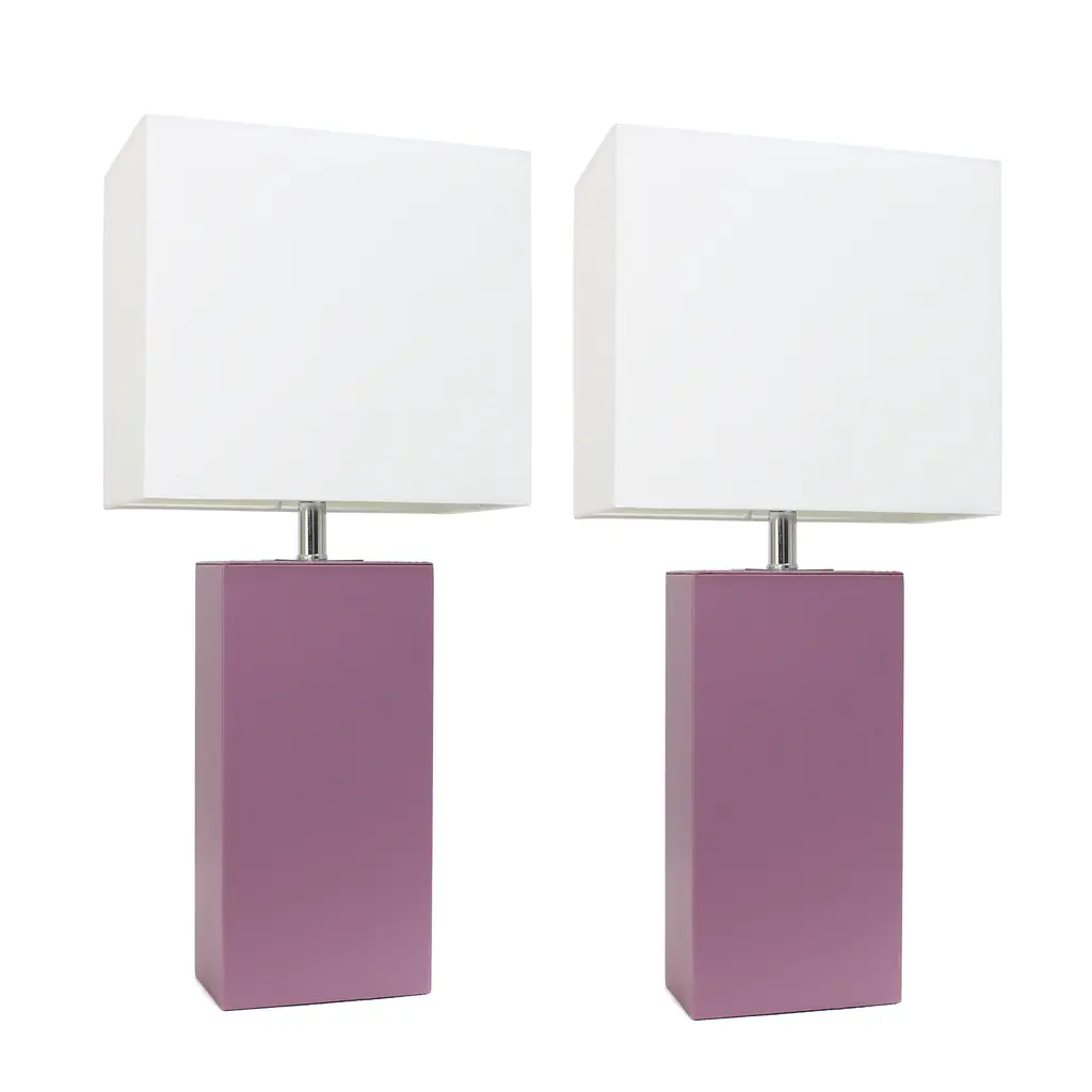 Enliven your living room or den with modern illumination using this set of purple leather table lamps with white shades. These lamps come in a set of two for easy coordination.Set Includes: 2 PieceNumber of Light: 1 LightShade Material: FabricLight Bulb Type: IncandescentBulb Wattage: 60 WLighting Type: Lamp SetsProduct Features: UL ListedMaterial: Fabric, Leather, MDFLight Direction: Multi-directionalAssembly: AssembledSwitch Type: Rotary SwitchLighting Style: Contemporary, ModernColor: PurpleDimensions: 10 inches long x 6 inches wide x 21 inches high