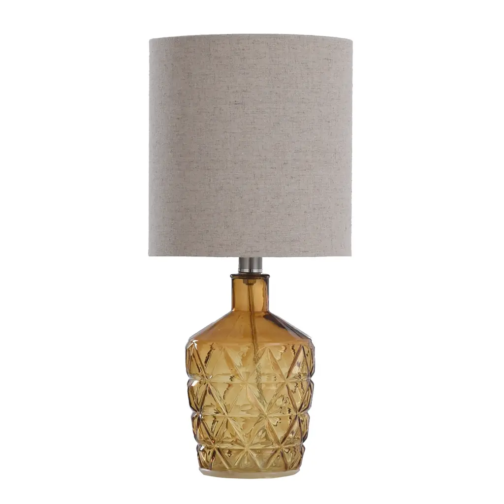 This glass table lamp showcases an open bottom design with textured detail. Its translucent orange body is perfectly paired with a brown shade, elevating the breezy casualness of this beauty. It's ideal for an airy, light-filled beach house or vacation home.This table lamp comes in a sunset amber finish with heathered light beige shade; Requires one (1) 40-watt Incandescent base bulb (not included).Open bottom design accent lampSwitch type: On/Off switch located at the neck of the lampDry Location - This item is rated for dry locations, meaning it can be used in an indoor area that is not normally subject to dampnessBody frame finish: Sunset AmberBody frame material: Textured GlassShade color: Heathered Light BeigeShade material: Polyester FabricVoltage: 110VFixture is compatible with Incandescent, Florescent or LED lamps. Must not exceed fixture wattageCord length: 60 inchesBase/ Body width: 5.5 inches wideShade dimensions: 9 inches high x 8.5 inches wideDimensions: 18 inches high x 8.5 inches wideDue to lighting and monitor differences, actual colors and finishes may vary slightly from what appears online.