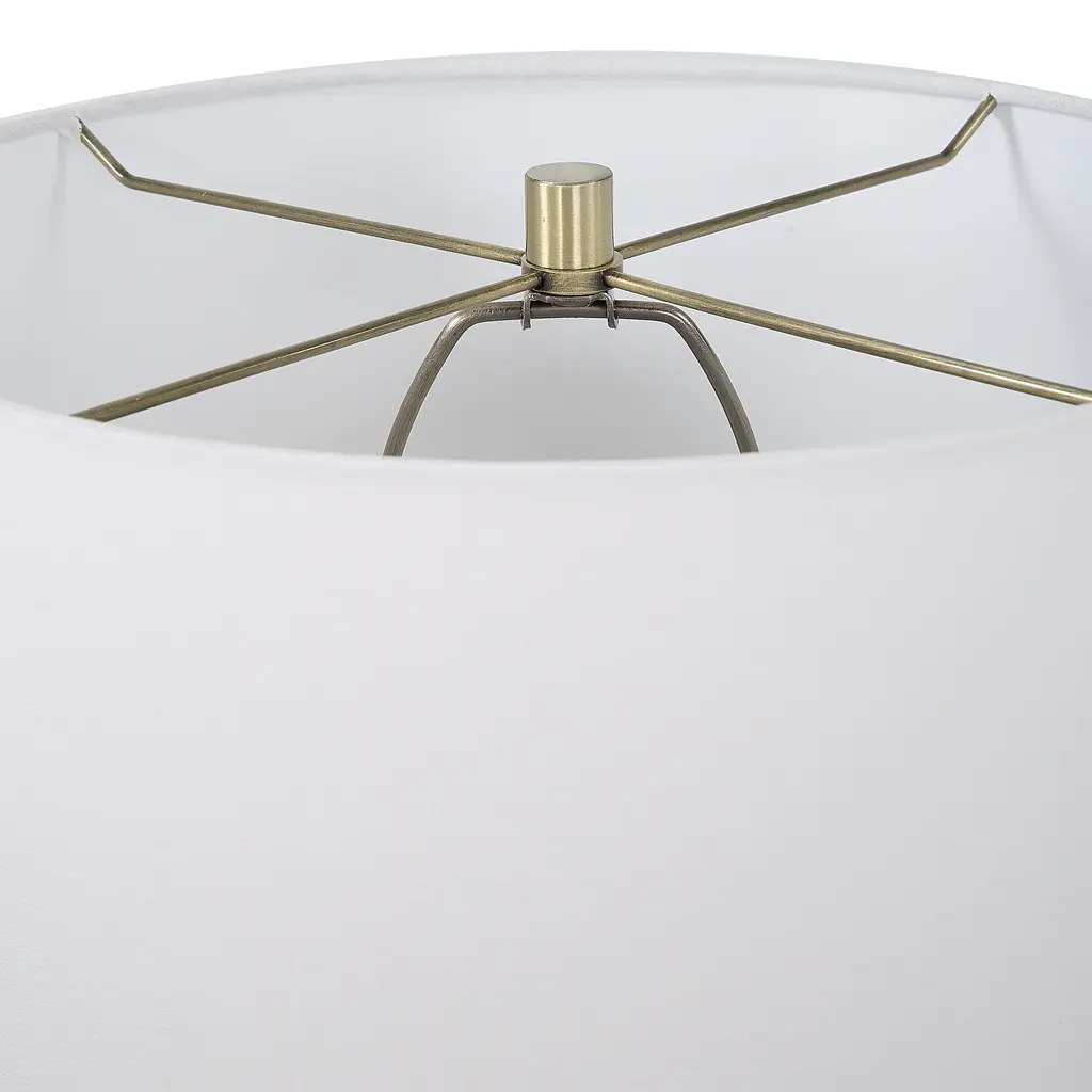 Illuminate your space with the understated elegance of the Matte White Ceramic and Crystal Table Lamp by Porch & Den. Crafted to blend seamlessly with modern, contemporary, and transitional styles, this lamp exudes effortless charm. The textured matte white lamp body boasts a casual yet sophisticated appearance, making it a versatile addition to any coastal or relaxed living environment. Resting atop a brushed brass foot, the lamp features a gradual flare for added visual interest. A delicate crystal ring lends a touch of refinement to the design. Topped with a white linen round hardback shade, this lamp emits a soft, inviting glow, creating a warm and welcoming ambiance in any room.Features:Dimensions:WARNING: This product can expose you to chemicals including nickel which is known to the State of California to cause cancer or birth defects or other reproductive harm. For more information, go to www.P65Warnings.ca.gov/furniture.
