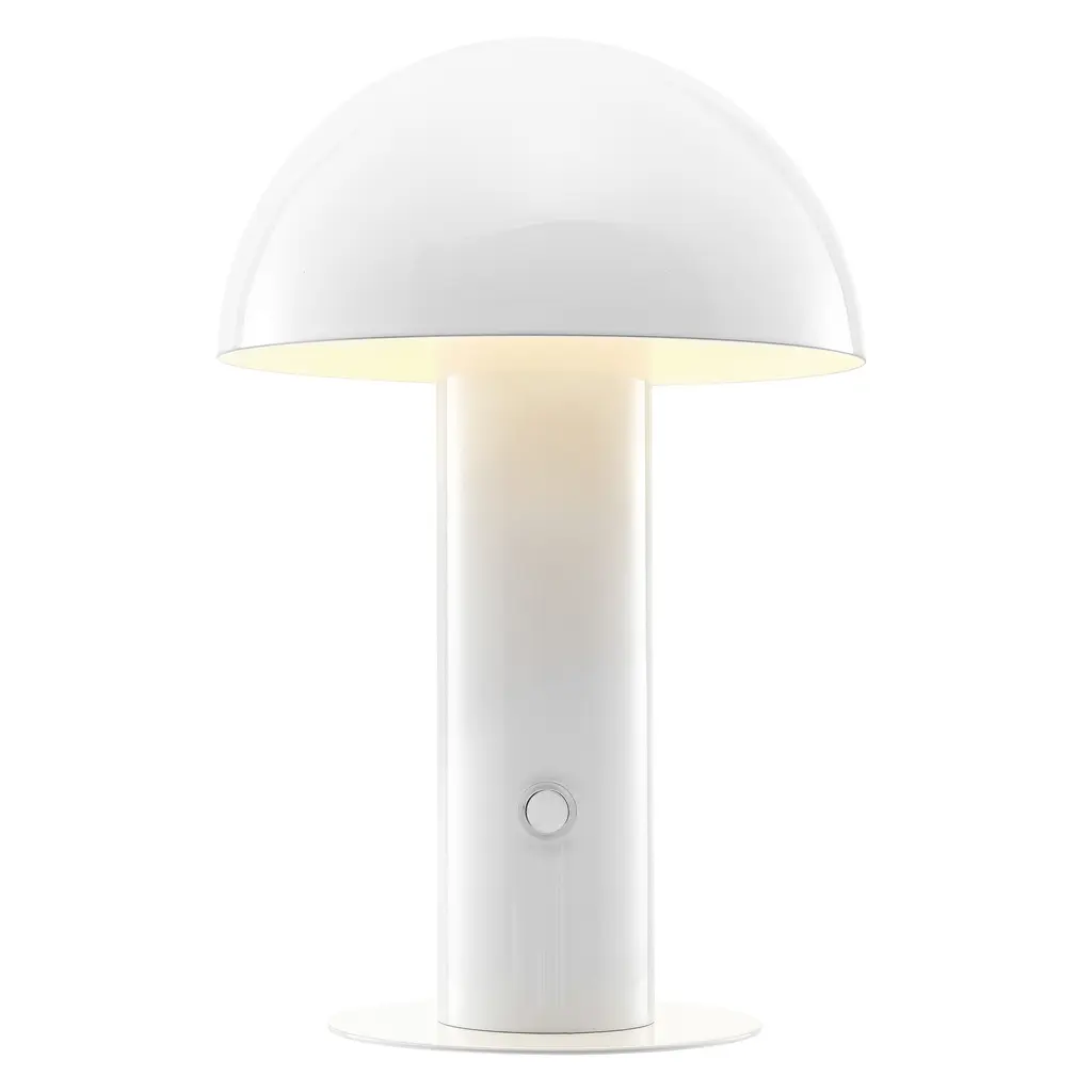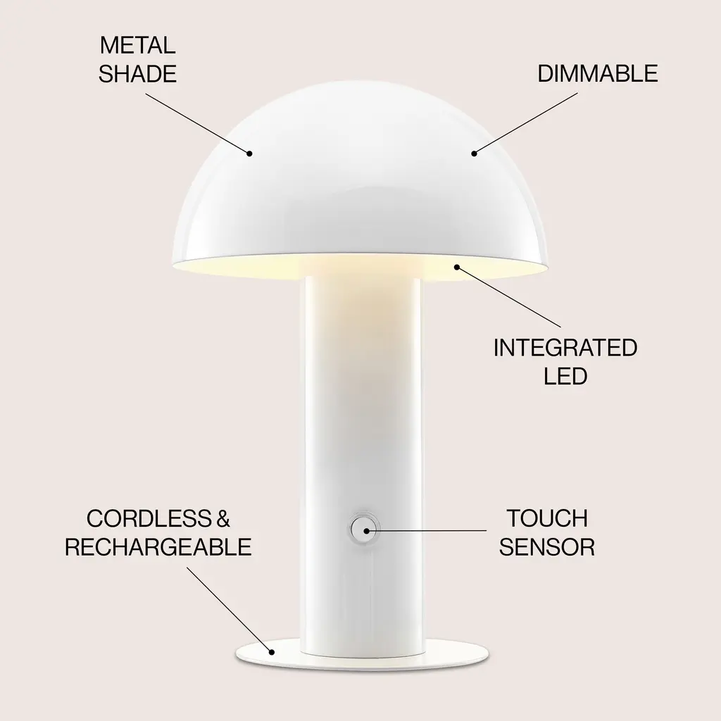 Our portable mushroom lamp's minimalist silhouette is the perfect modern accent for a desk, bar console or vanity. This cordless, rechargeable lamp provides dimmable mood lighting for your dining room, living room, bedroom, or entry. The durable metal design features integrated LED bulbs and a touch sensor to control the three brightness settings. Features: Dimensions: About us:You see a lamp.We see a decorative work of art.A perfectly curved shade casts a dramatic shadow on a floor. Compatible with LED lightbulbs: as easy on the environment as they are on the eyes. The JONATHAN Y Lighting collection considers every detail from impeccably sourced materials to designer styling. And our prices are so attractive, we've transformed a functional necessity into a fashion accessory.JONATHAN Y Lighting - a fashion revolution in home decor.