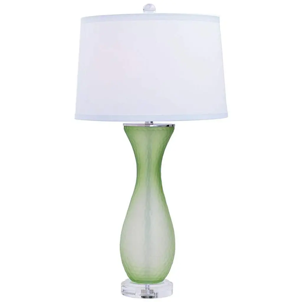 Make an elegant statement on a side table or console with this hand-cut glass table lamp from Port 68. Beautifully designed, the lamp features frosted green glass with a curvy hourglass silhouette. Polished nickel accents complement a Lucite base and crystal ball finial. A polyester drum shade assures soft, diffused lighting for any room. 36" high overall. Shade is 17" wide at the top x 19" wide at the bottom x 12 1/2" on the slant. Weighs 9.77 lbs. Bottom of the base is 6 1/2" wide. From base bottom to shade bottom is 23 1/2". Uses one maximum 150 watt 3-way bulb (not included). 3-way switch. Lakeview glass table lamp from Port 68. Hand-cut frosted green glass body. Polished nickel accents. Crystal ball finial. Lucite base. Round drum polyester shade. Ships via UPS Free shipping in the U.S.
