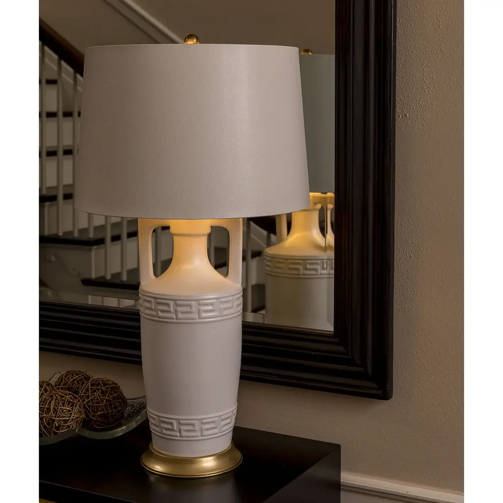 Port 68 Hollywood regency styled lamp features a carved key pattern in the lamp base with a sensuous matte white glazed porcelain body. Accents of a solid brass base and aged brass finished ball finial. 3 way switch. 150 watt max. Shade: Hardback drum shade with soft rolled edge trim. 16" x 18" x 12SH. Faux lizard skin fabric shade. Interior of shade is lined in gold foil. Materials: porcelain, brass Overall Dimensions: Size: 34"H x 18"D Free shipping in the U.S.