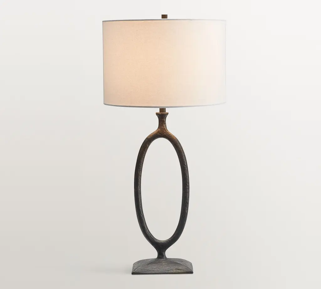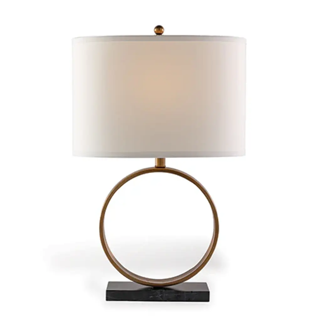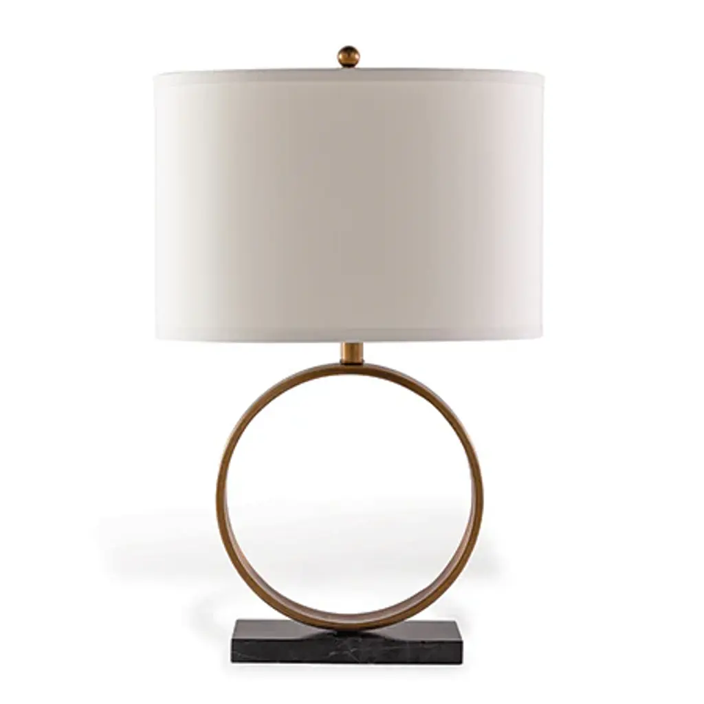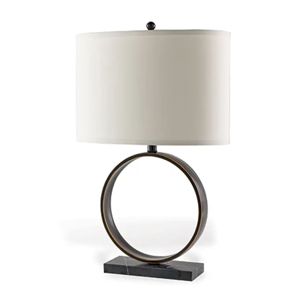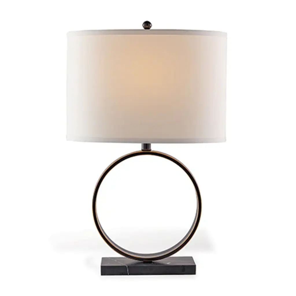 Megan is our transitional modern lamp of metal and stone. A circular bronzed or aged brass finished metal ring is mounted on the rectangular marble base and complimented with an oval hardback shade. Metal ball finial. 3 way switch. 100 watt bulb max. Shade: Hardback oval shade with single fold trim. 16"W x 10"D. Off white polyester fabric. Note: shade and lamp base ship in one box. Measurement: 26"H x 16"W x 10"D Materials: steel, marble stone Free shipping in the U.S.